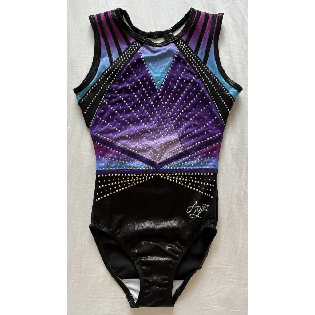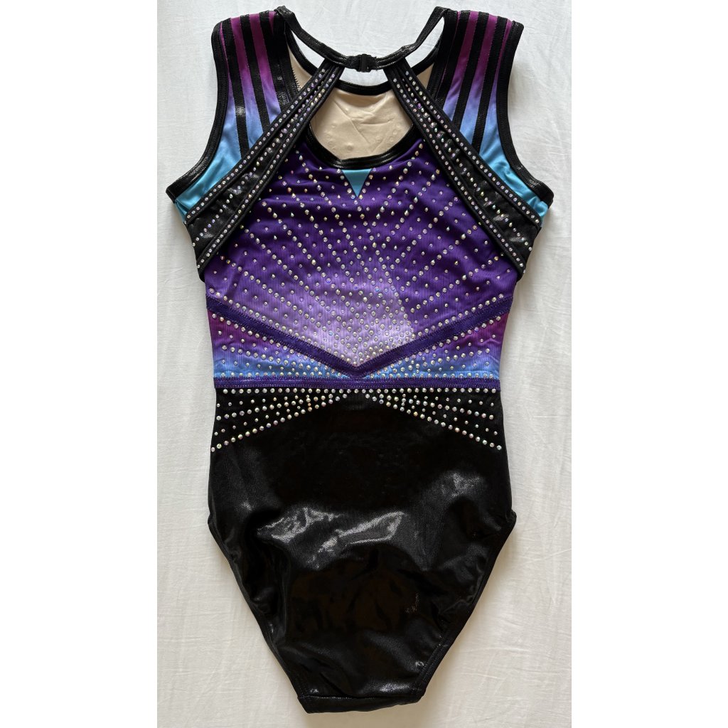 Krásný závodní či tréninkový dres bez rukávů. Spodní část dresu je z černé lesklé látky. Horní část dresu tvoří přechody modré a fialové barvy, doplněny černou aplikací. Výstřih je vpředu i vzadu do písmene U a vzadu je dres na zapínání. Lemování je černé. Dres je bohatě ozdoben stříbrnými kamínky. Vzadu má dres elegantní průstřih.