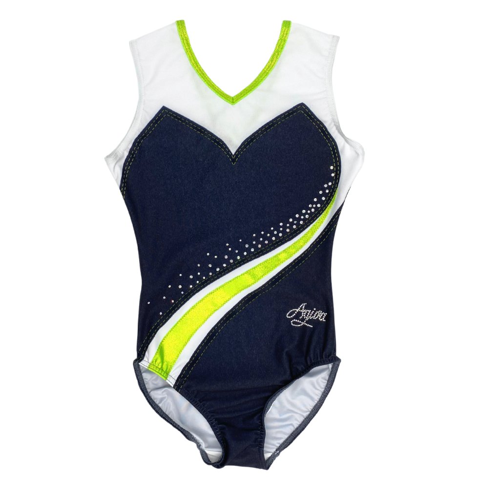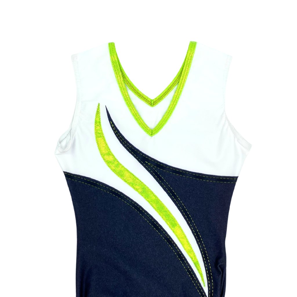 Závodní či tréninkový dres bez rukávů, z kombinace tmavě modré matné látky. Látka je v odstínu "jeanů". Dres se doplněn aplikacemi v jasně zelené a bílé kombinaci. Na přední části dresu je aplikace ze stříbrných strassových kamínků. Výstřih je vpředu i vzadu mírně do V a je lemován třpytivou zelenou barvou "kiwi".
