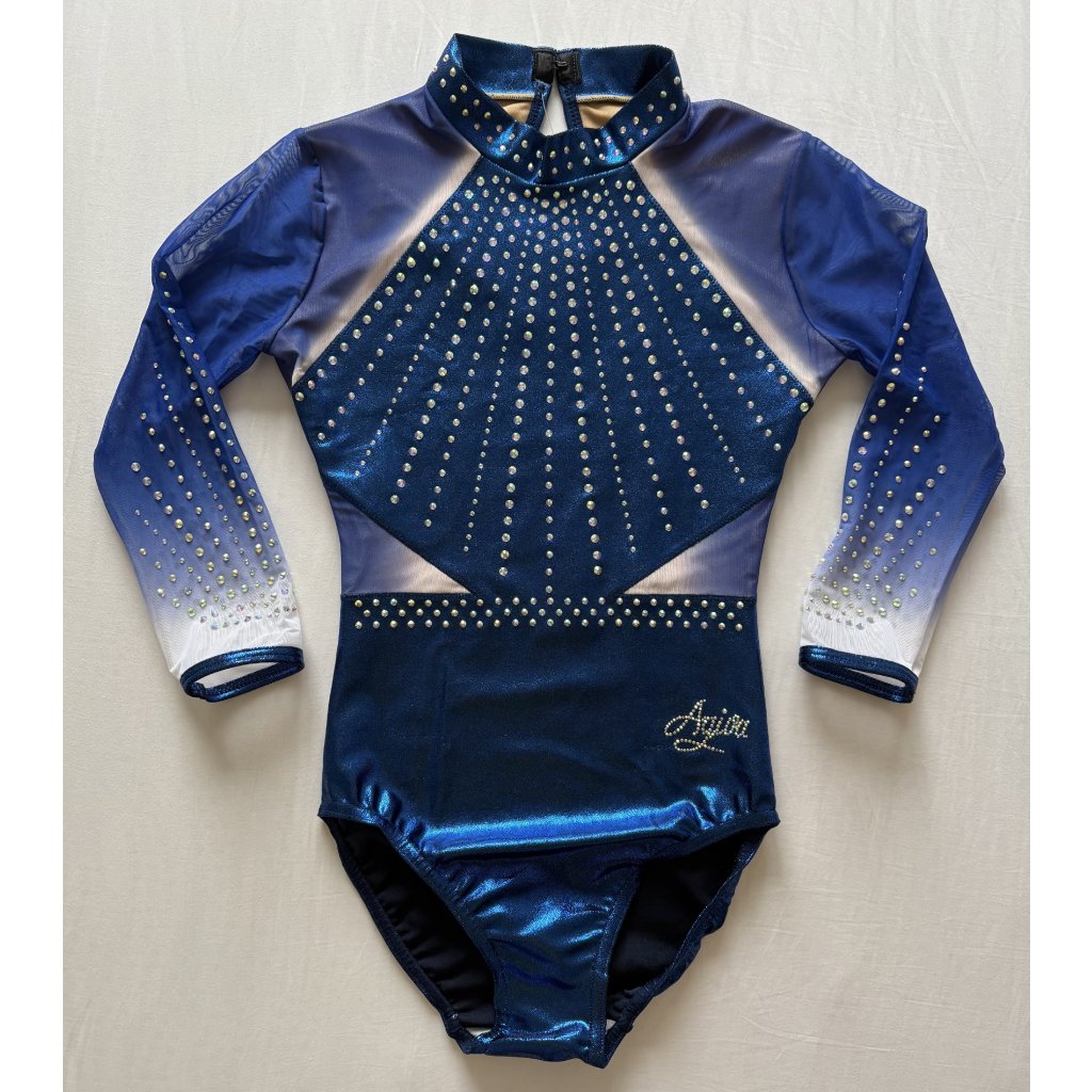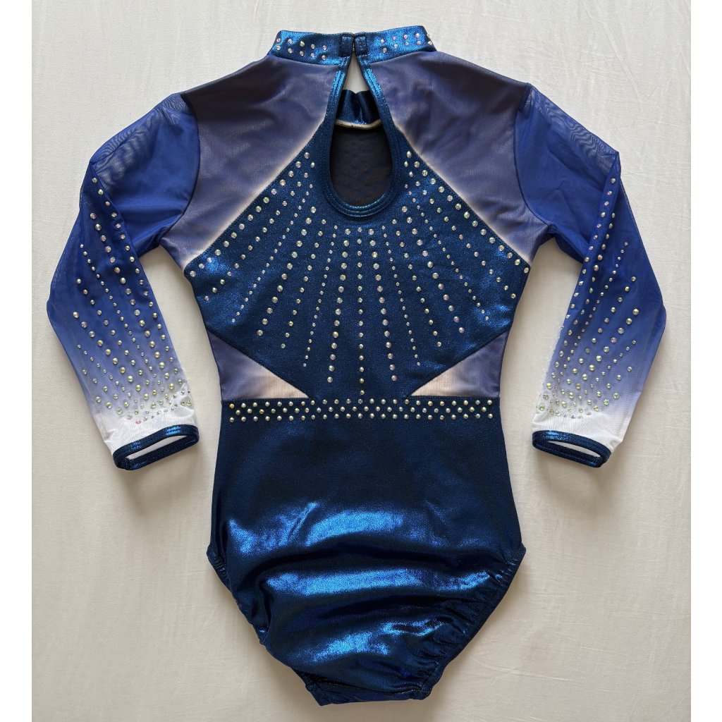 Elegantní závodní dres s dlouhým rukávem. Ve spodní části je dres tvořena tmavě modrou (royal blue) lesklou látkou. Na ramenou a rukávech je dres z tmavě modré látky, která přechází do bílé. Bílé klínky jsou i na bocích. Dres je bohatě dozdoben stříbrnými kamínky. Výstřih má vyšší modrý stojáček u krku a vzadu je dres na zapínání, které tak tvoří elegantní kapku. Rukávy jsou z jemné síťky zdobené kamínky.