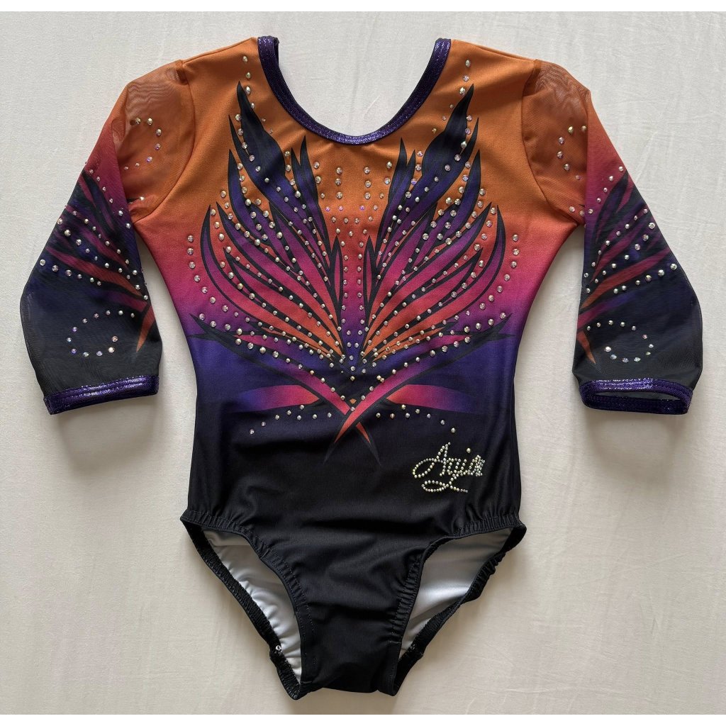 Krásný a výrazný závodní dres s dlouhým rukávem. Dres je ve spodní části ušit z matné ombré látky - látka přechází z černé, přes fialovou až po oranžovou. Rukávy jsou ušity z jemného tylu. Konec rukávů je fialovém lackshinu. Výstřih je ve tvaru U a dres je vpředu a na rukávech doplněn stříbrnými strassovými kamínky.