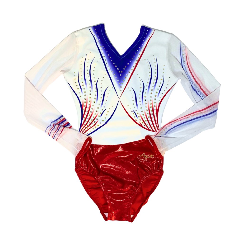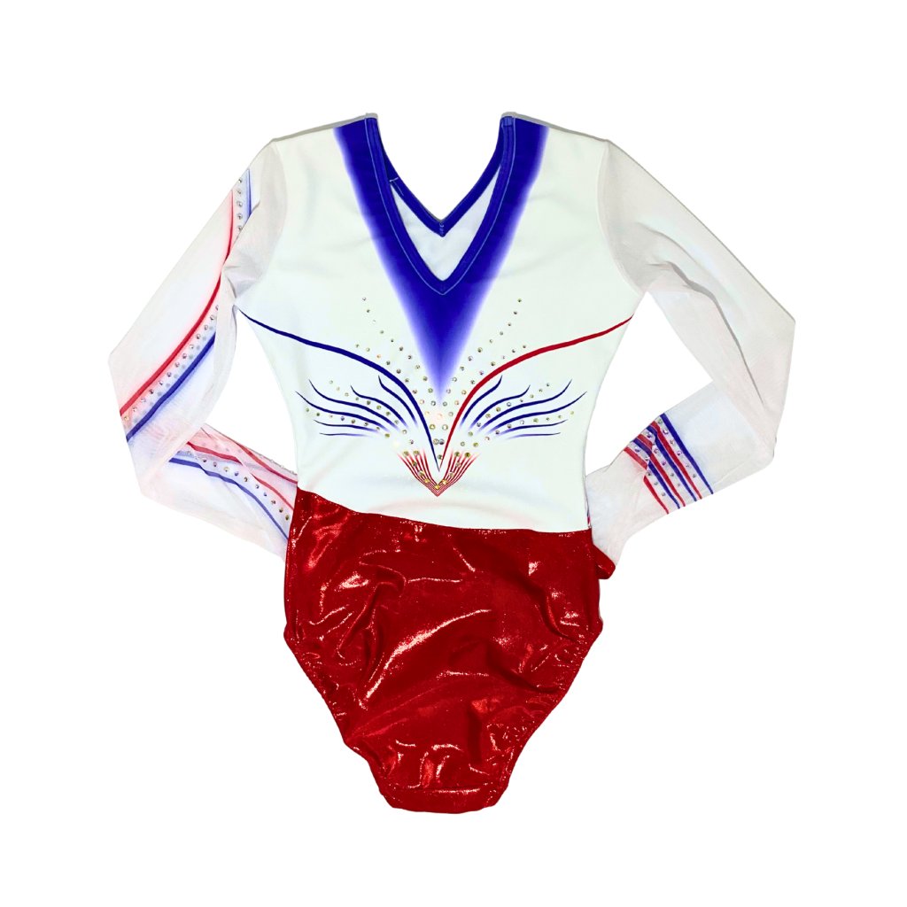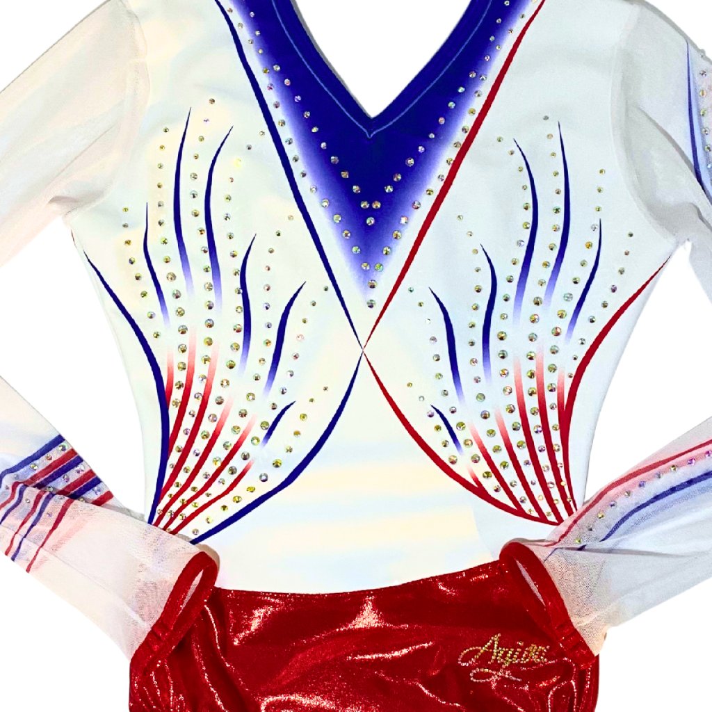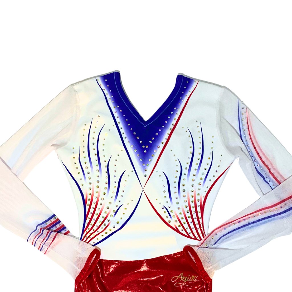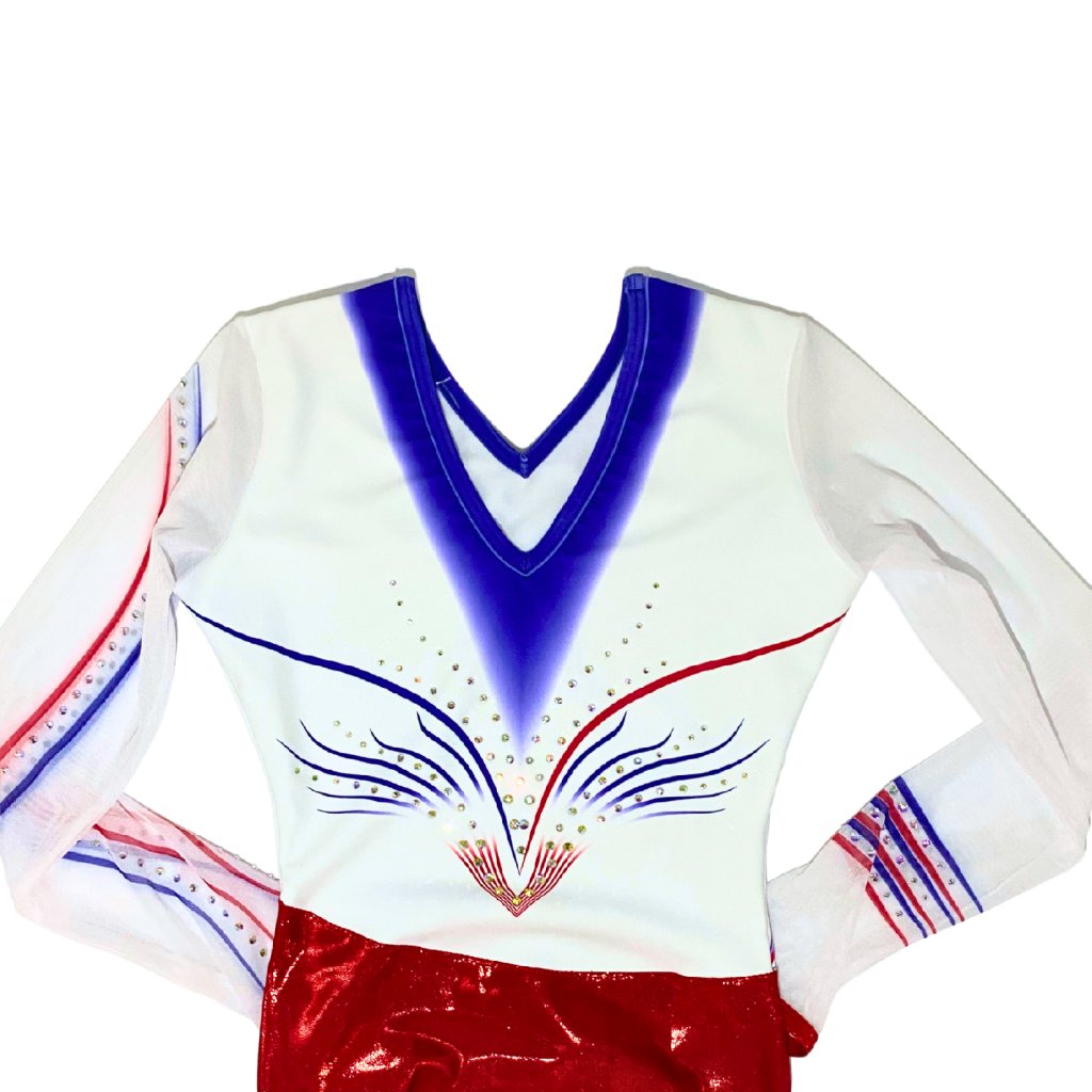 Elegantní závodní dres v národních barvách. Spodní část dresu tvoří jasně červená lesklá látka, která je doplněna bílý vrškem s tmavě modrou aplikací z příjemného mikrovlákna. Rukávy jsou z bílé tylové látky s modrou a červenou aplikací. Dres je dozdoben stříbrnými strassovými kamínky. Výstřih je vpředu a vzadu do písmene V