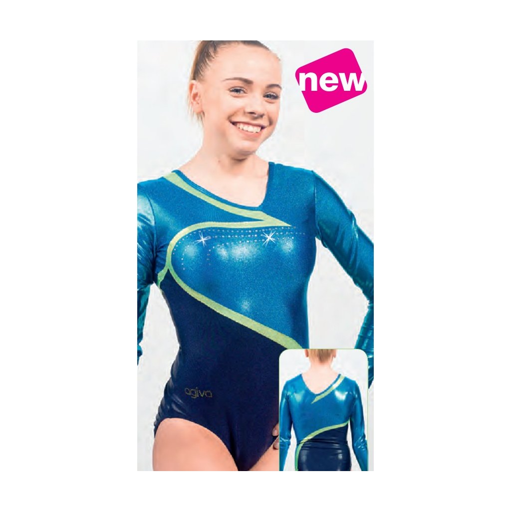 Elegantní závodní dres s dlouhým rukávem. Spodní část dresu je ušita z tmavě modré, lesklé látky, typu lack-shine. Vrchní část a rukávy jsou taktéž z lesklé látky typu lack-shine, v odstínu caribic - jasně modrá. Mezi modrými aplikace je aplikace v barvě kiwi - světle zelená. Vše je doplněno stříbřitými strassovými kamínky. Výstřih je do V vpředu i vzadu mírně protažený a je lemován tmavě modrou látkou, typu lack-shine.