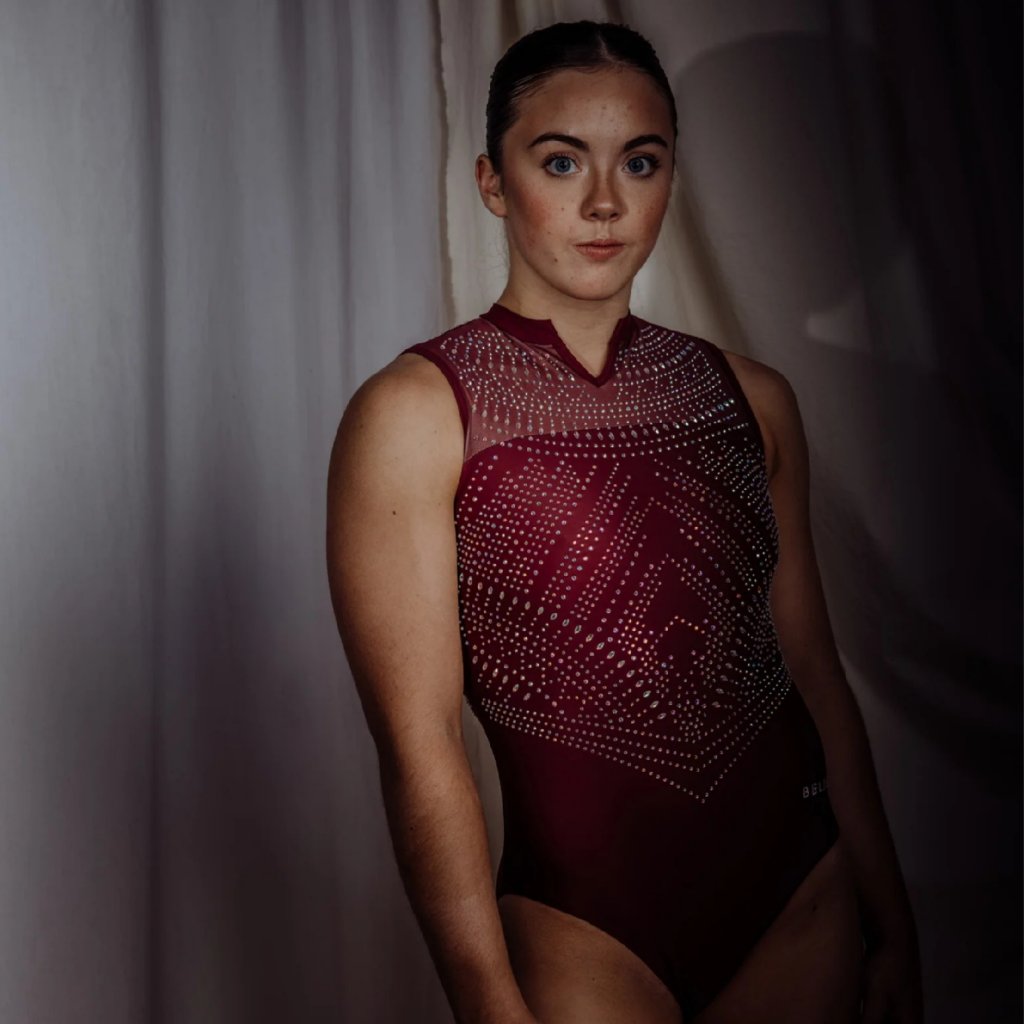 Krásný tréninkový dres značky Believe leotards. Velmi elegantní a krásný dres s krátkým rukávem. Dres je z vínového mikrovlákna doplněn vínovými detaily z mesh látky. . Dres je bohatě ozdoben strassovými kamínky.