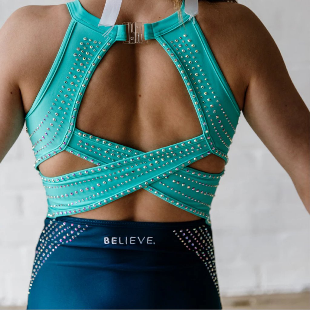 Krásný tréninkový dres značky Believe leotards. Velmi elegantní a krásný dres s krátkým rukávem. Dres je z petrolejové matné látky. Vrchní část je ze svěětle modrého mikrovlákna. Dres je bohatě ozdoben strassovými kamínky.