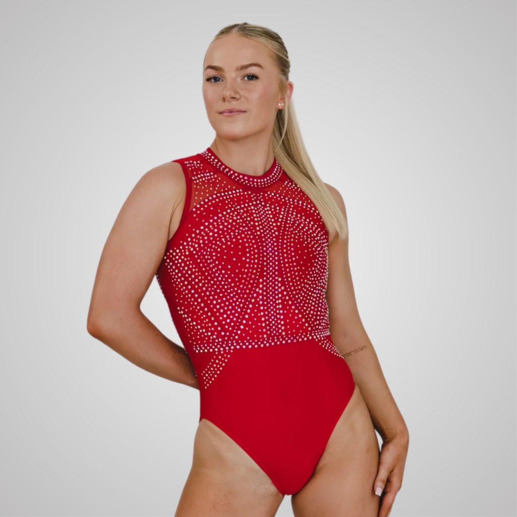 Krásný závodní dres neb o tréninkový dres značky Believe leotards. Velmi elegantní a krásný dres s krátkým rukávem. Dres je z červené matné látky a je bohatě ozdoben strassovými kamínky.