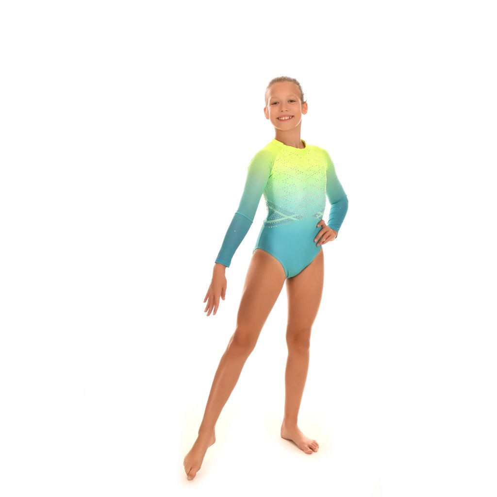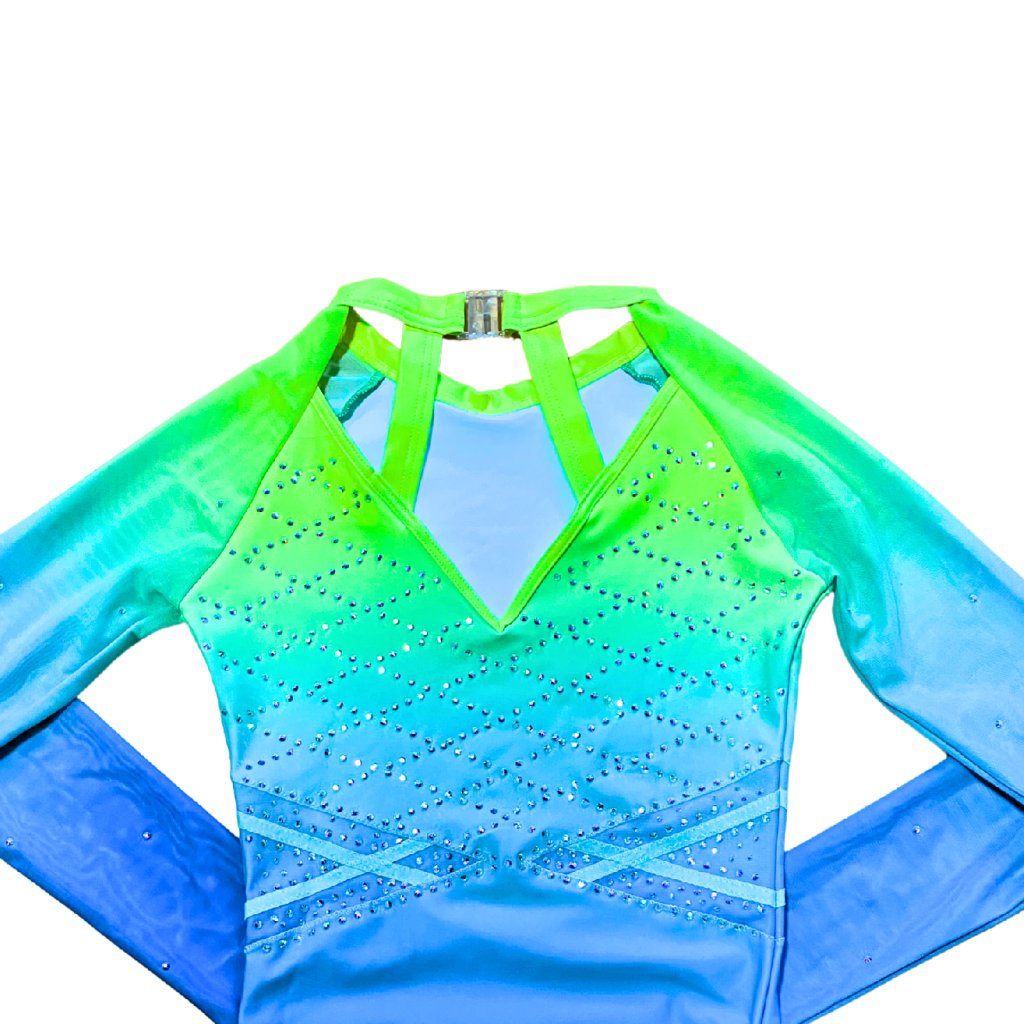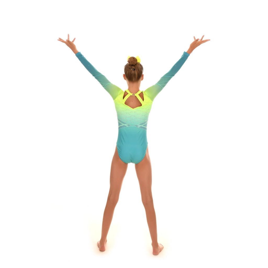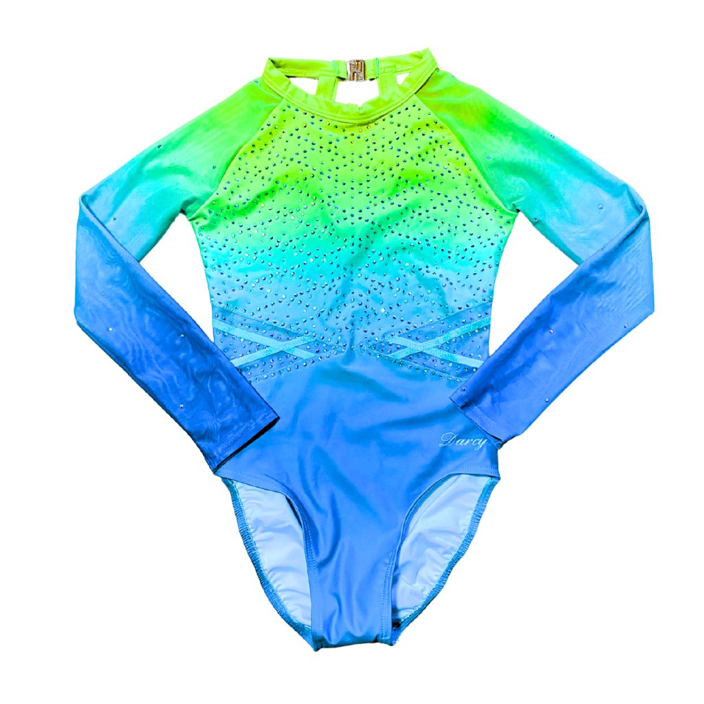 Krásný závodní dres značky Darcy leotards. Velmi elegantní a krásný dres s dlouhým rukávem. Dres je z míkrovlákna s ombré přechodem ze světle modré do neonově žluté barvy. Záda jsou zajímavě překřížená. Dres je dozdoben strassovými kamínky