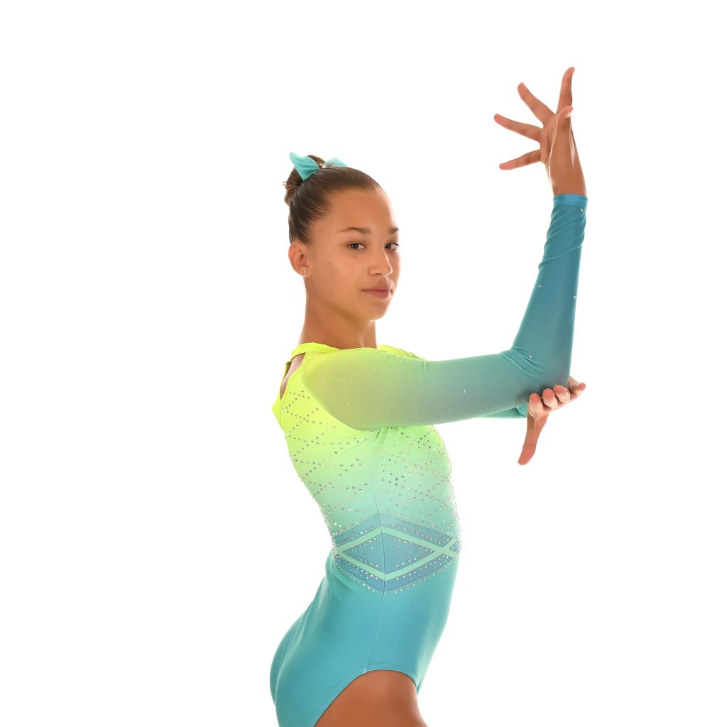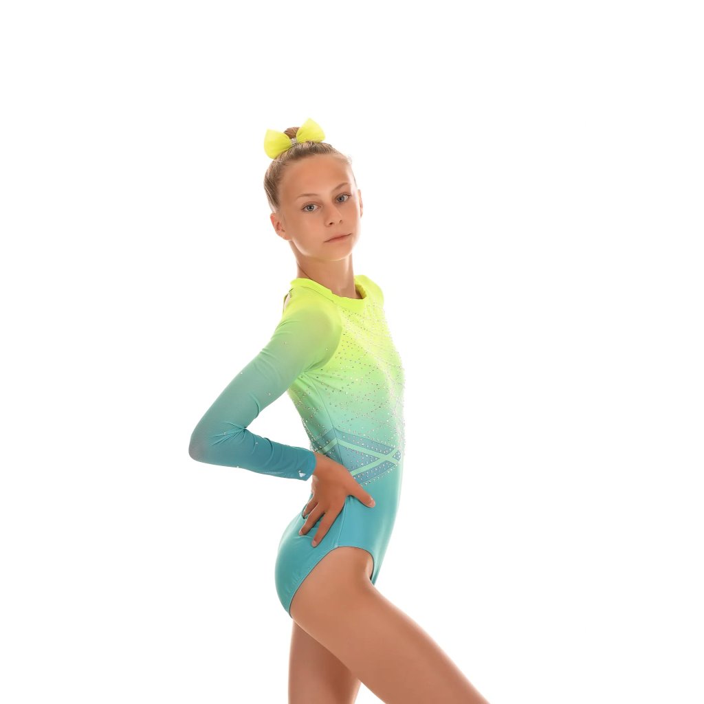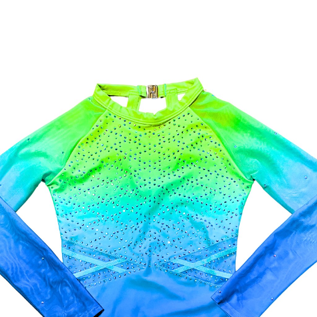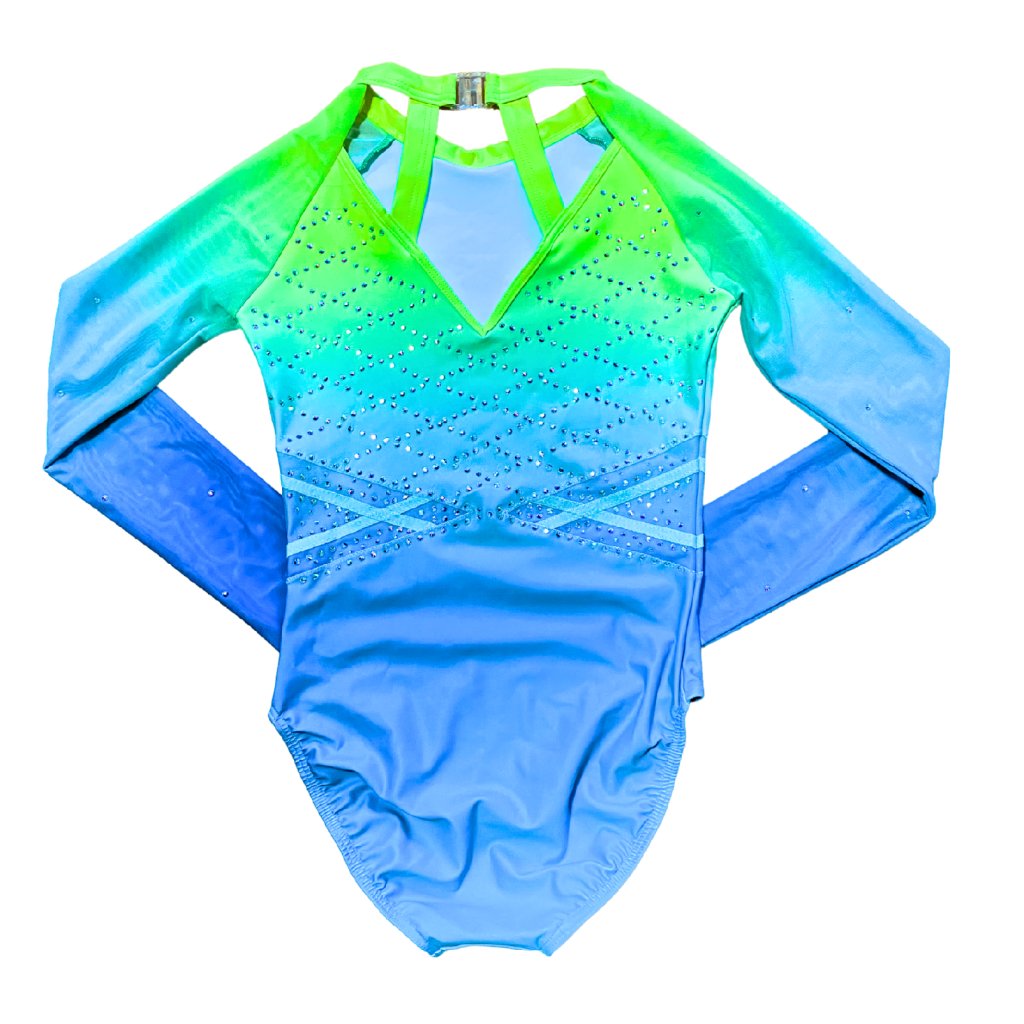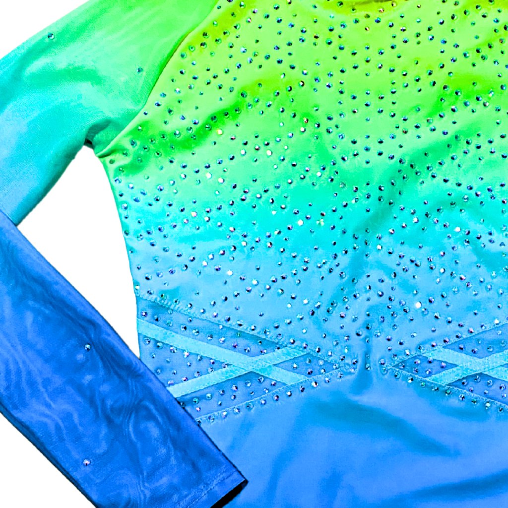 Krásný závodní dres značky Darcy leotards. Velmi elegantní a krásný dres s dlouhým rukávem. Dres je z míkrovlákna s ombré přechodem ze světle modré do neonově žluté barvy. Záda jsou zajímavě překřížená. Dres je dozdoben strassovými kamínky