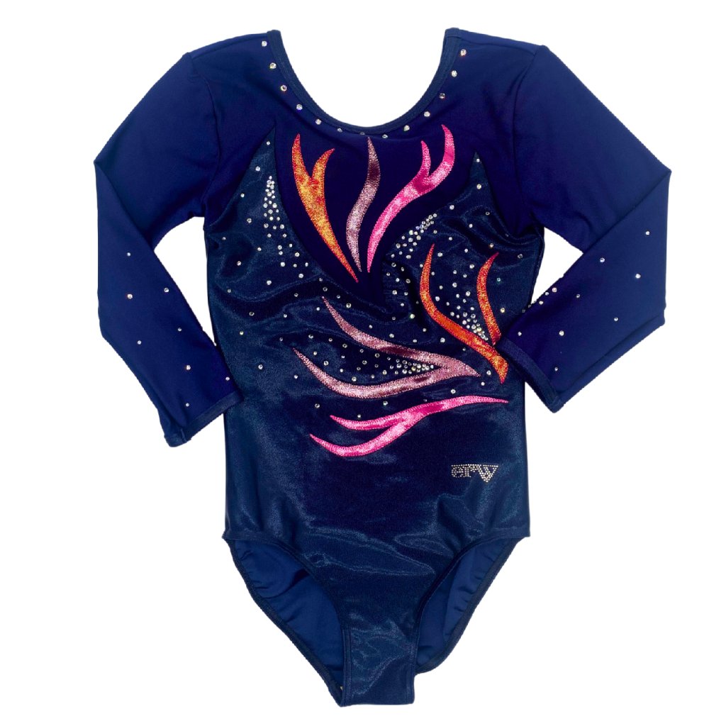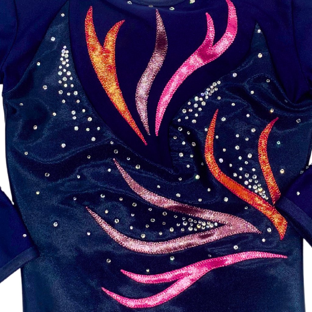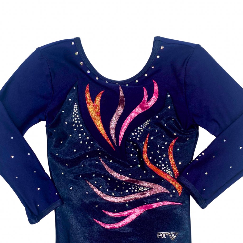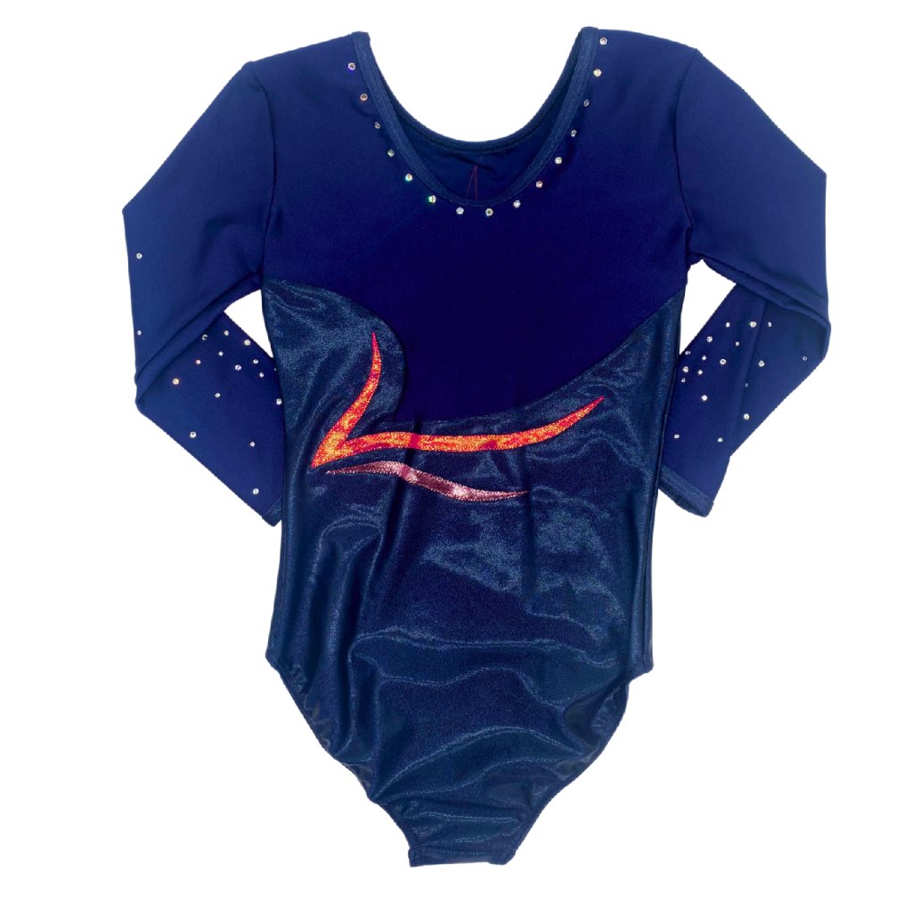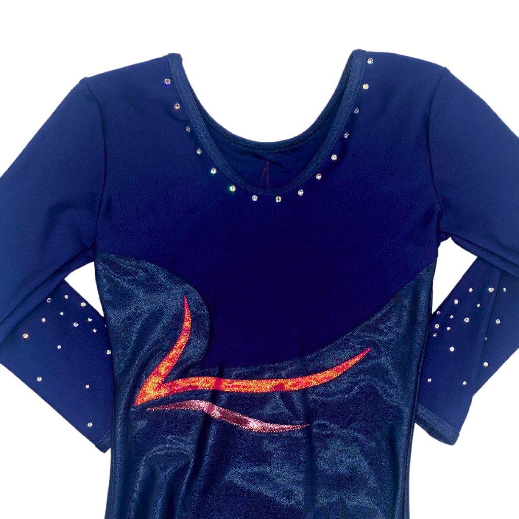 Velmi elegantní í závodní dres, s dlouhým rukávem. Základní barvou tohoto dresu je tmavě modrá - navy plavkovina kombinovaná s tmavě modrým lesklým lack-shinem. Výstřih je kulatý. Zdobeno kamínky v stříbrné barvě. Rukáv je 3/4 délky.
