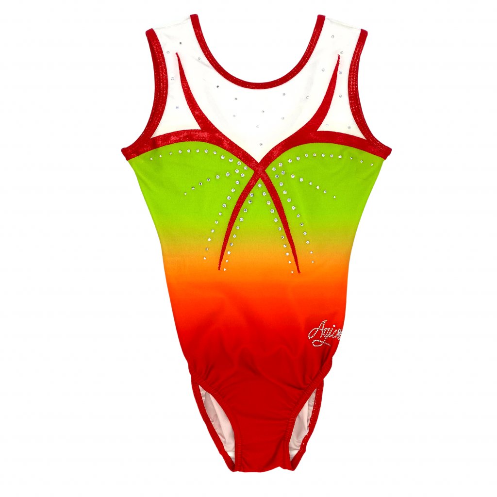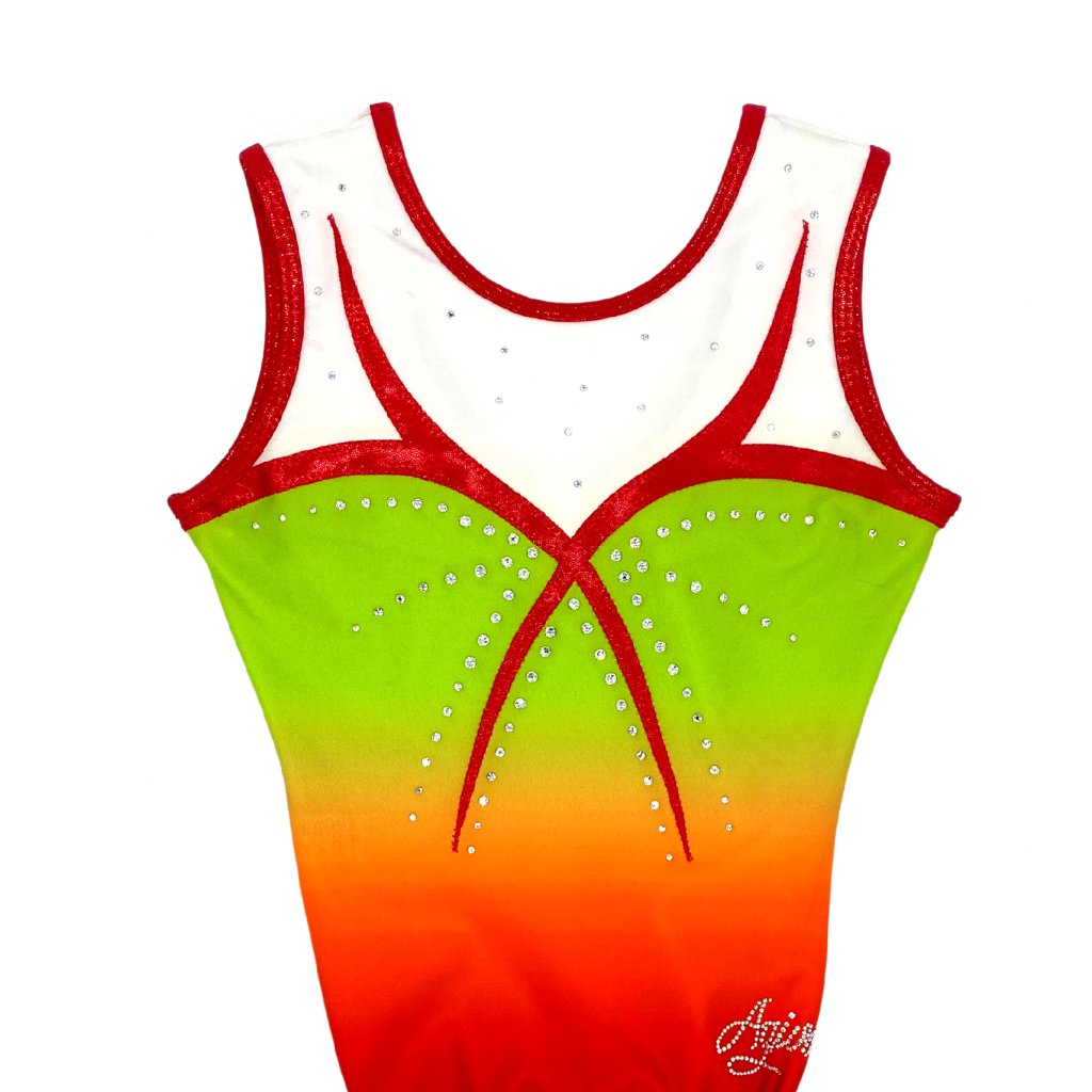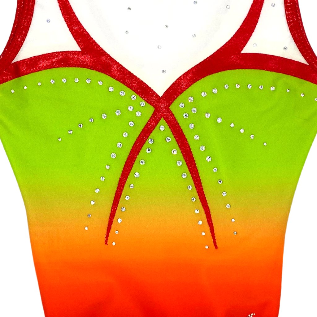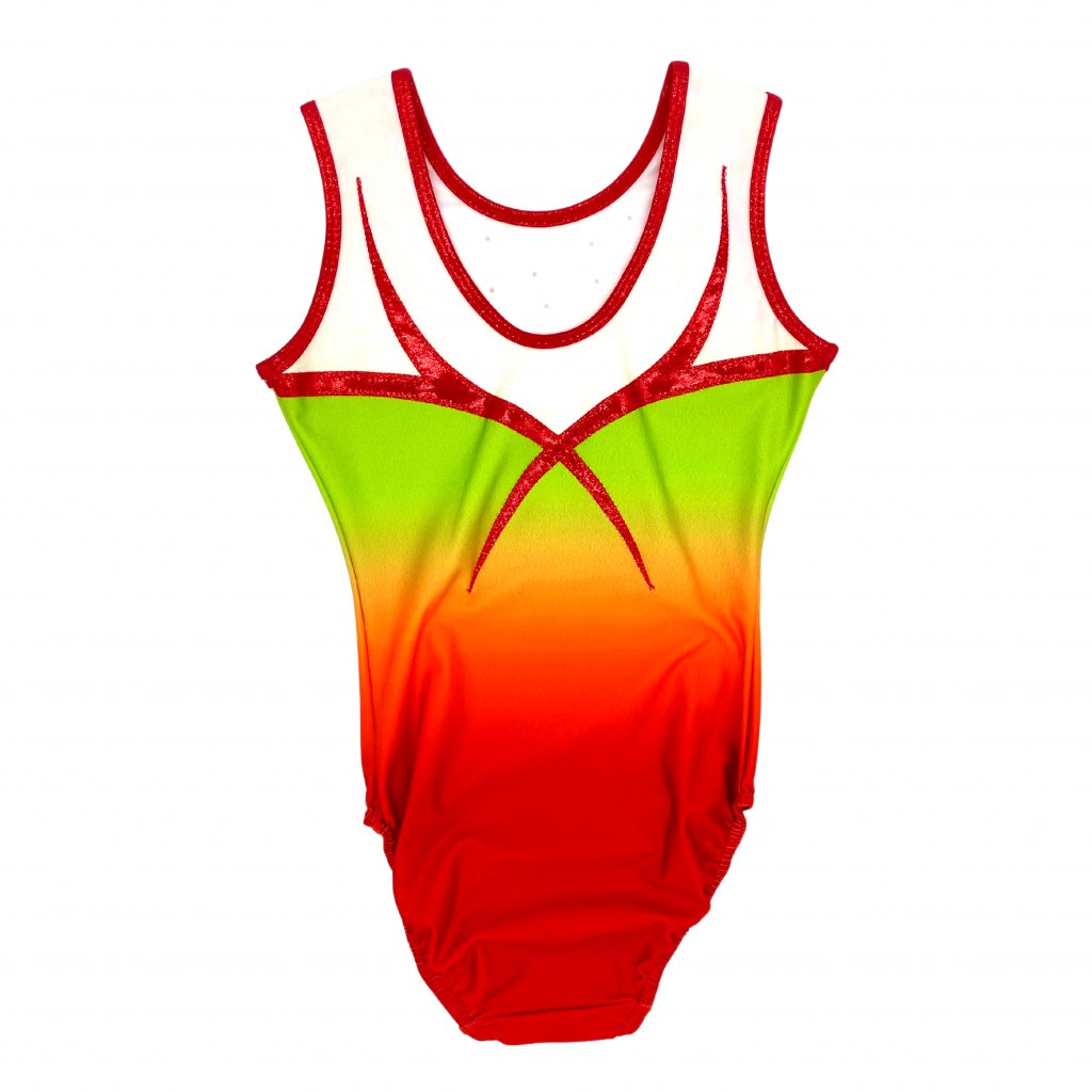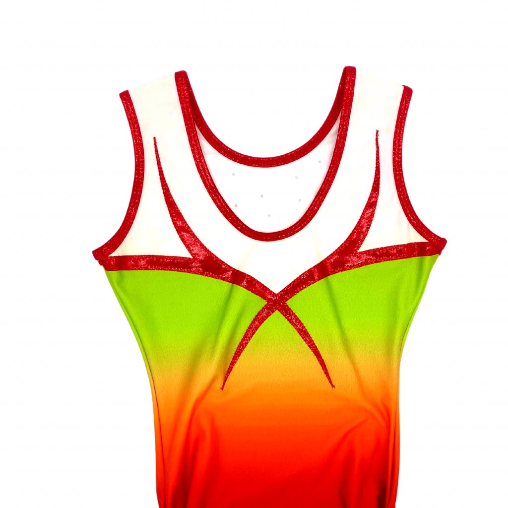 Závodní či tréninkový dres bez rukávů. Základní barvou tohoto dresu je matná látka v ombré stylu - barva přechází z oranžové do světle zelené barvy. Sedlo dresu je v matné bílé, která je poseta stříbrnými strassovými kamínky. Tělo dresu je odděleno proužkem ve výrazné, sytě červené barvě, stejně tak jako lem výstřihu a rukávů. Vše je dozdobeno aplikací ze stříbřitých nažehlovacích kamínků. Výstřih je vpředu typu U, vzadu protažený.