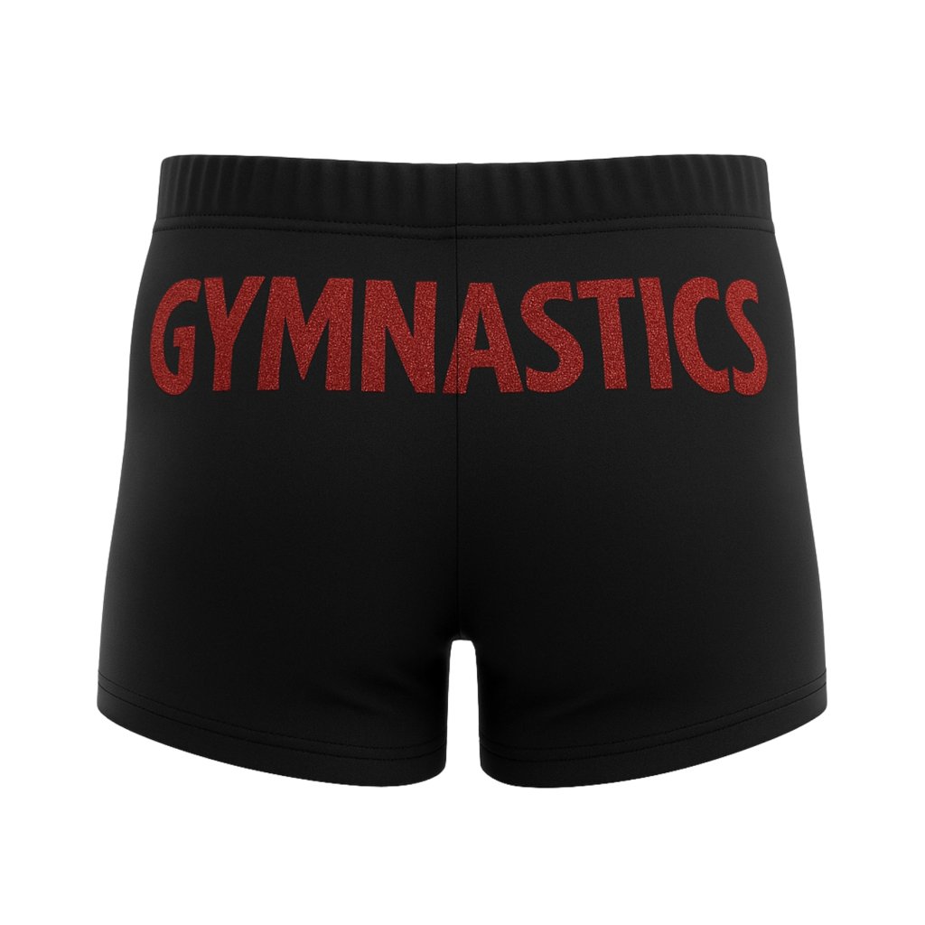 V pase je pohodlná širší guma, která zajišťuje perfektní přilnutí bez nepříjemného zařezávání. Na levé nohavici je umístěno třpytivé logo MG (Morys-Gymnastics), zatímco zadní stranu zdobí výrazný třpytivý červený nápis GYMNASTICS.