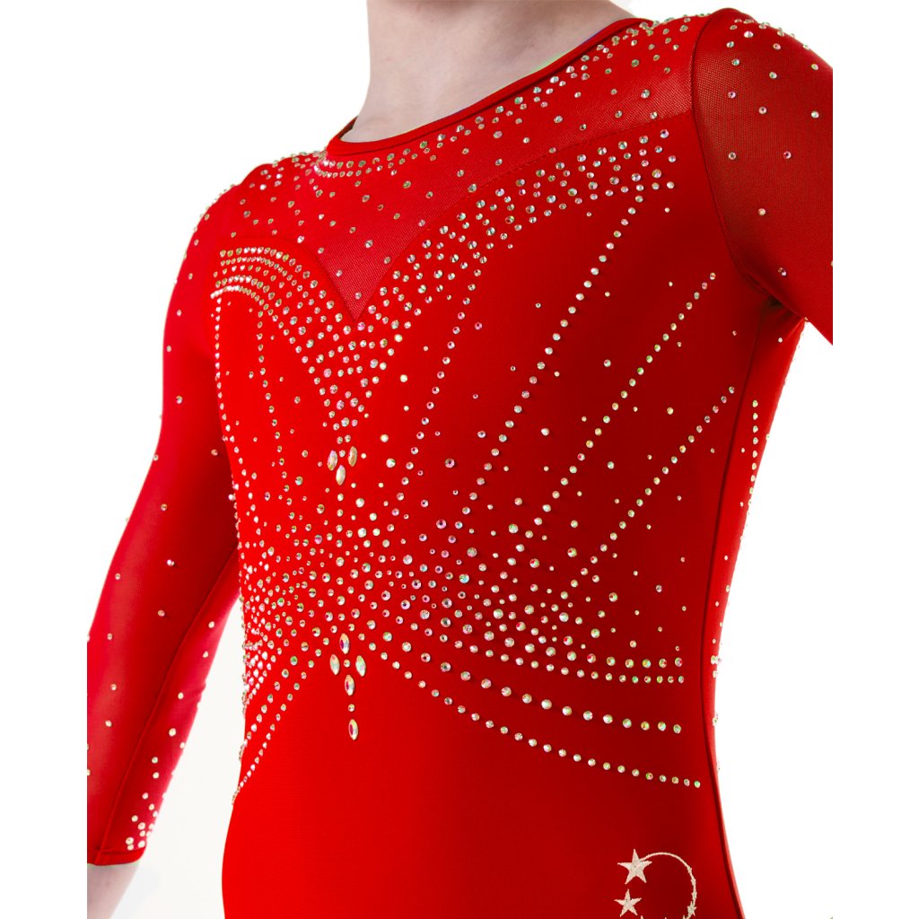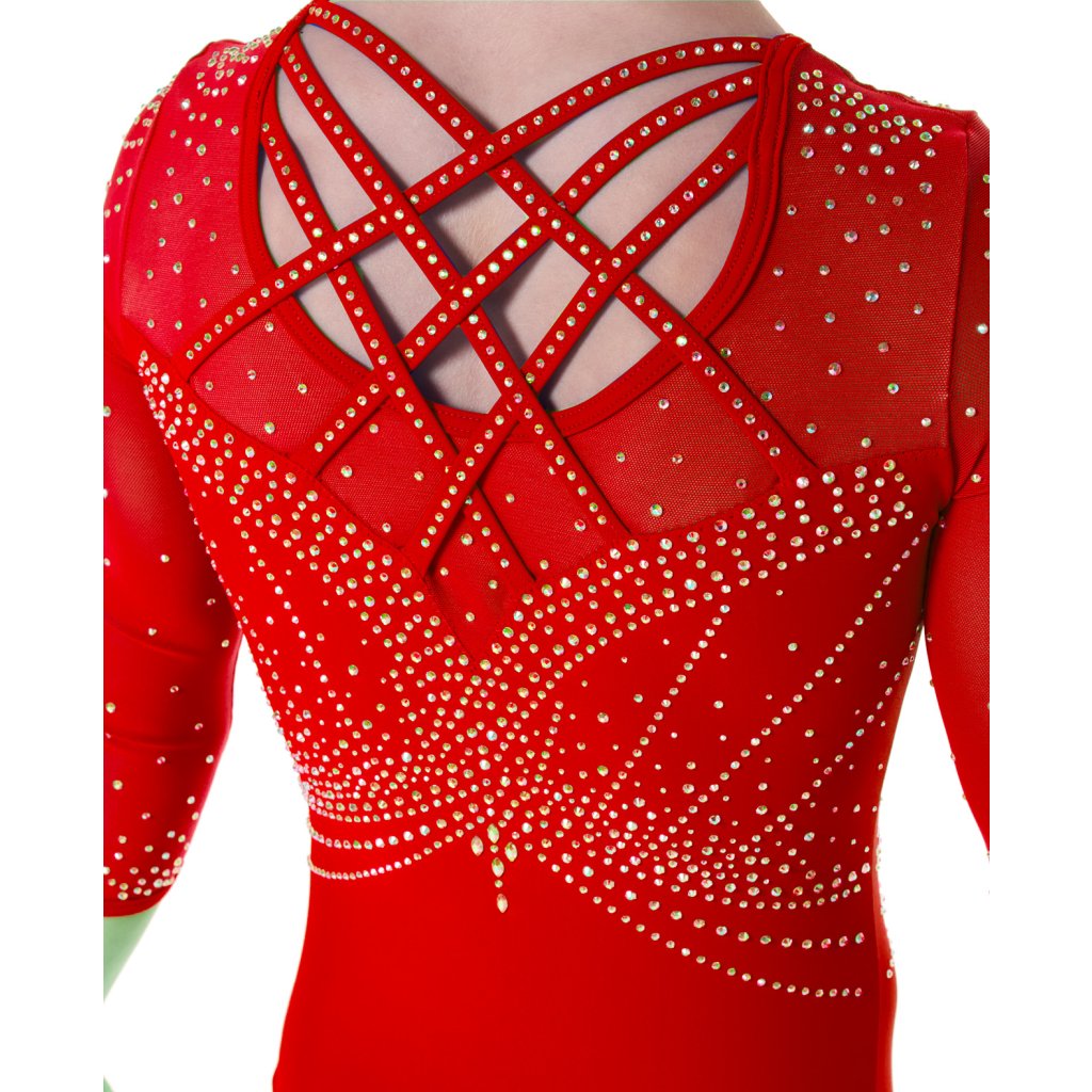Velmi povedený dres od značky Little Stars Leotards. Velmi elegantní a krásný závodní dres s dlouhým rukávem. Základní barvou tohoto dresu je červená látka. Dres je podšitý tělovou látkou aby neprosvítal. Dres je bohatě dozdoben strassovými kamínky. Rukávy jsou z tylové látky. Lemování dresu je kolem krku, rukávů a průstřihu zad v červené barvě. Dres má na zádech zajímavé překřížení.