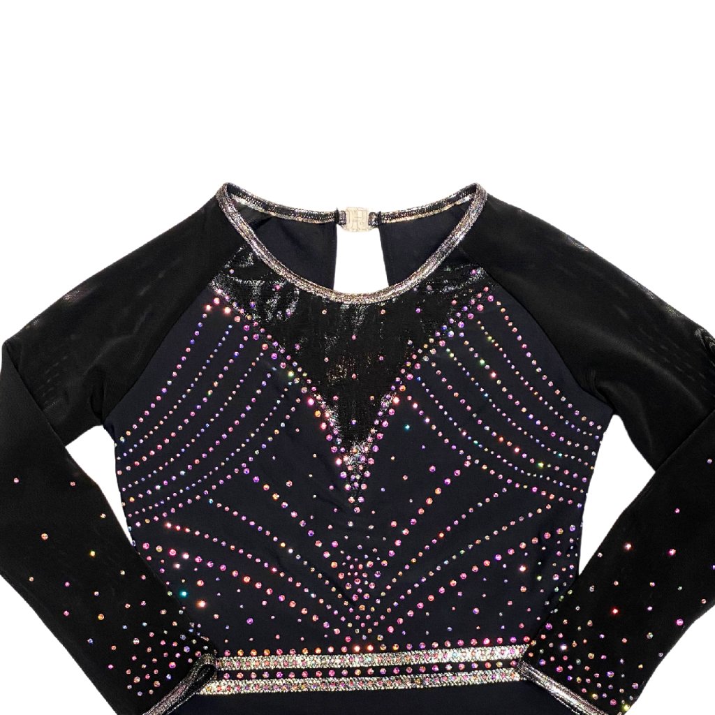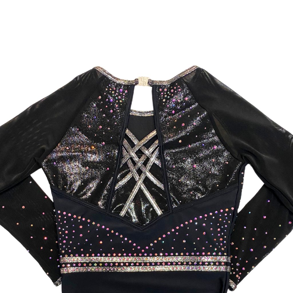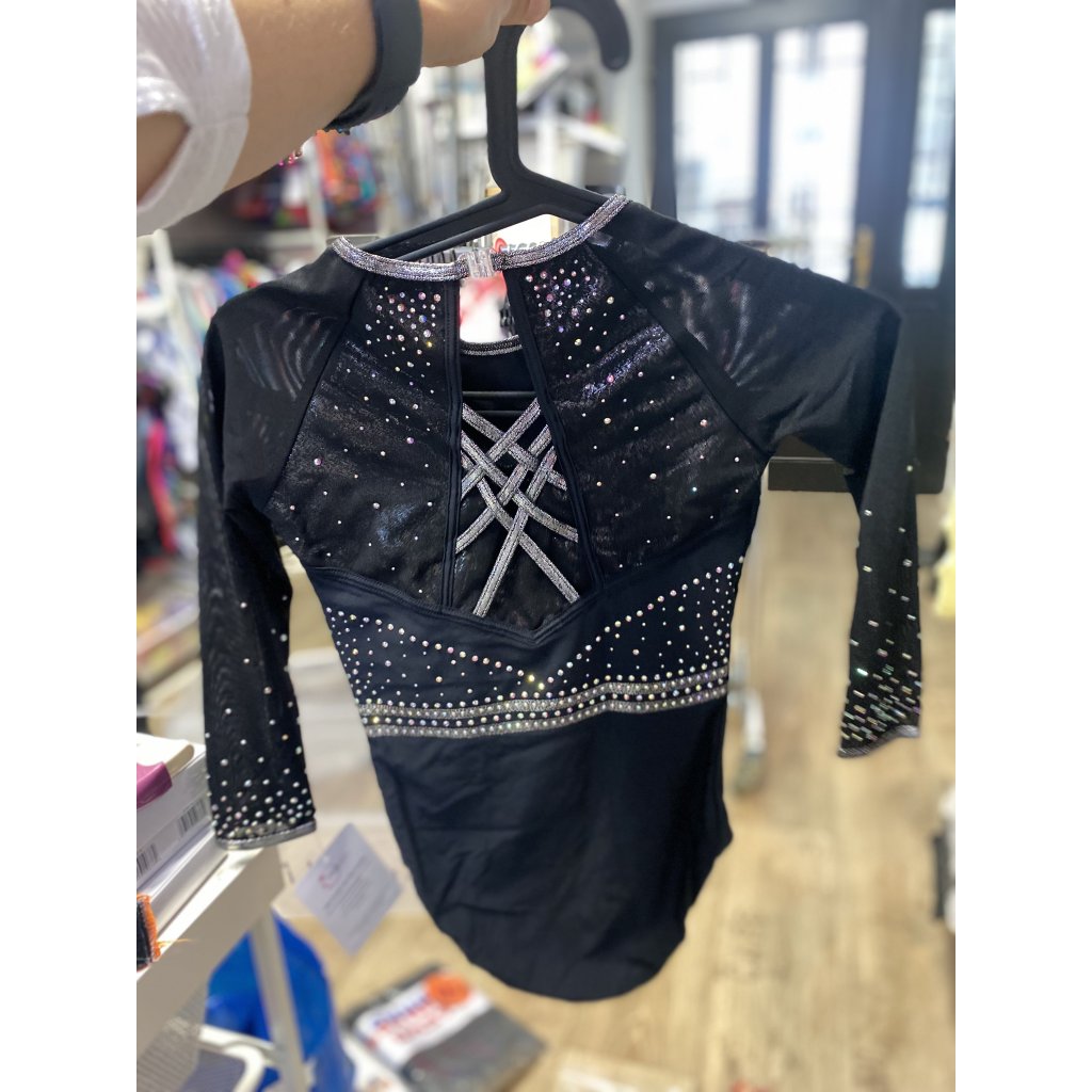 Velmi povedený dres od značky Little Stars Leotards. Velmi elegantní a krásný závodní dres s dlouhým rukávem. Základní barvou tohoto dresu je černá látka. Dres je podšitý tělovou látkou aby neprosvítal. Dres je bohatě dozdoben strassovými kamínky. Rukávy jsou z tylové látky. Lemování dresu je kolem krku, rukávů a průstřihu zad ve stříbrné barvě. Dres má na zádech zajímavé překřížení a je upnutý ke krku na plastové zapínání.