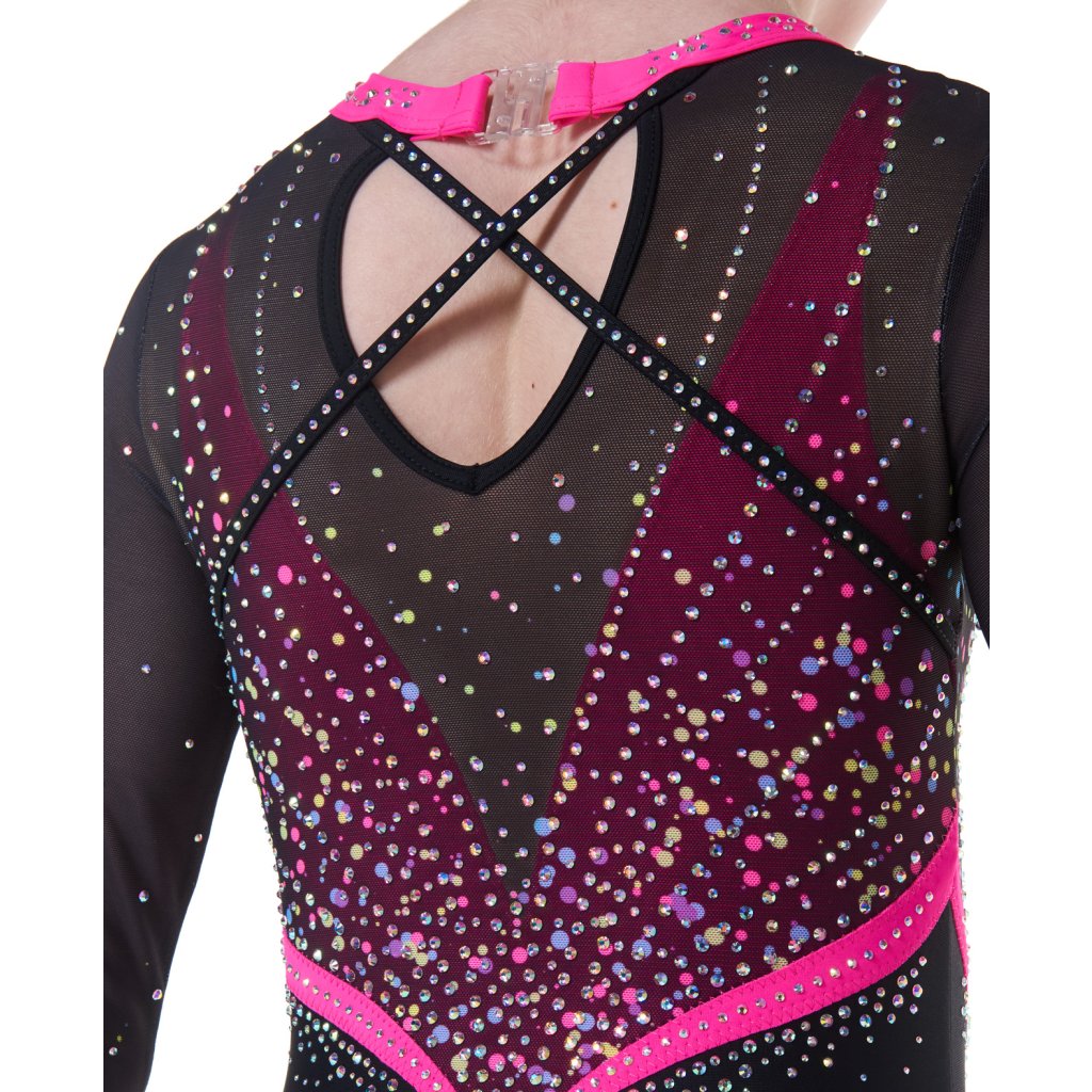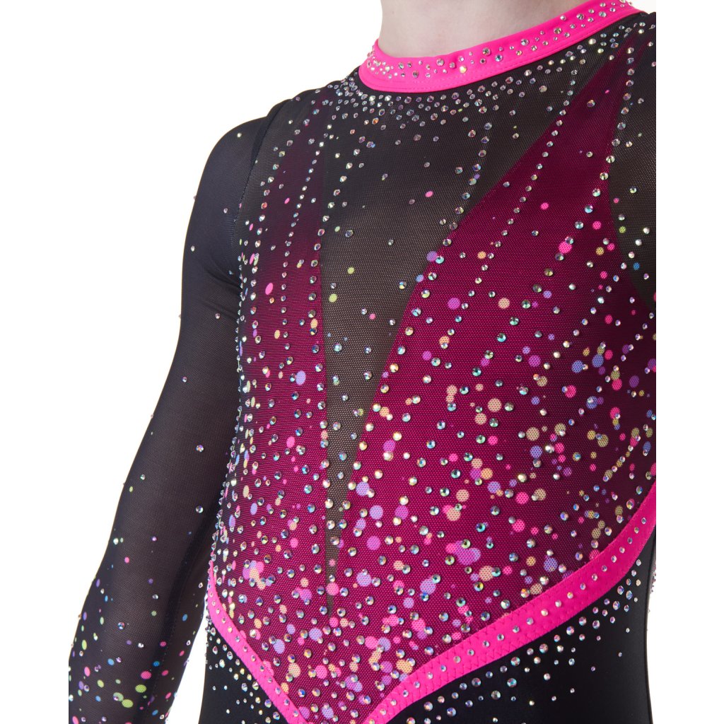 Velmi povedený dres od značky Little Stars Leotards. Velmi elegantní a krásný závodní dres s dlouhým rukávem. Základní barvou tohoto dresu je černá látka. Dres je podšitý tělovou látkou aby neprosvítal. Dres je bohatě dozdoben strassovými kamínky. Rukávy jsou z tylové látky s ombré efektem. Lemování dresu je kolem krku, rukávů a průstřihu zad v černé barvě. Dres má na zádech slzu a je upnutý u krku na plastové zapínání.