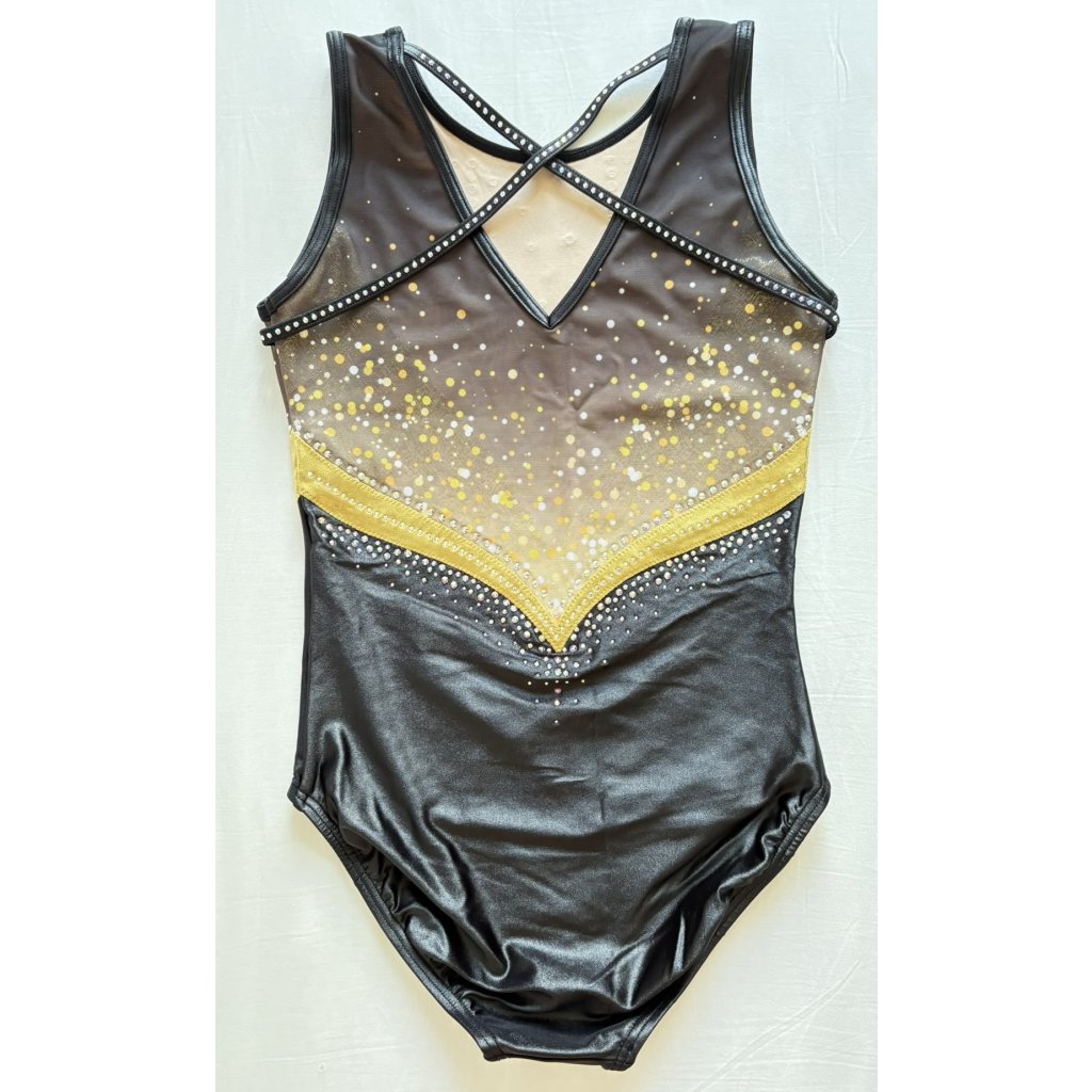 Krásný tréninkový dres Little stars leotards z kolekce Mix it up . Dres je z černé látky se zlatými detaily a zajímavý překrytím z tylové látky.. Dres je dozdoben strassovými kamínky a je podšit tělovou barvou. Výstřih na zádech je se zajímavým překřížením.