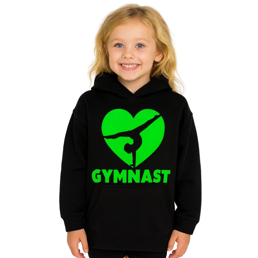 Na přední straně se vyjímá velké srdce s gymnastkou v neonově zelené barvě a výrazný nápis GYMNAST z matné neonové fólie. Tento motiv dodává mikině svěží, sportovní a moderní vzhled.