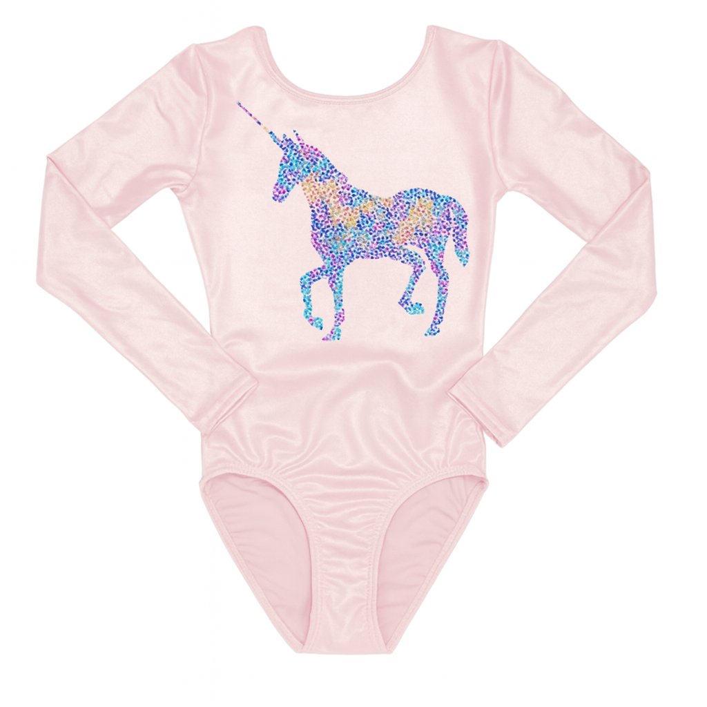 Závodní, nebo tréninkový dres s dlouhým rukávem. Dres je ušit z vysoce lesklé metalické látky typu lack-shine, ve světle růžové barvě. Na dresu je aplikace z nažehlovacích glitrů s motivem jednorožsce. Lem výstřihu a rukávů je z třpytivé látky ve stejné barvě jako je dres. Výstřih je kulatý, vpředu i vzadu. Na zadní straně je mírně protažený.