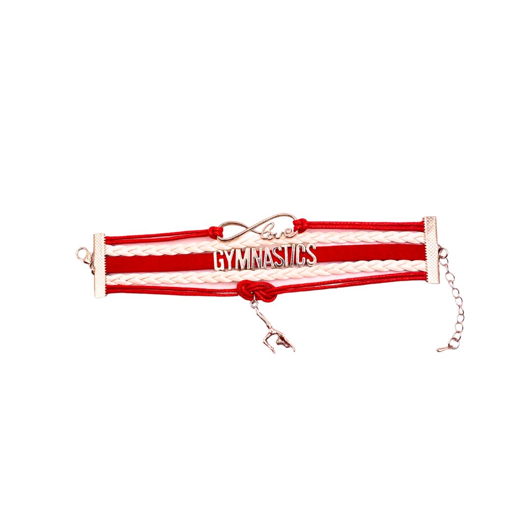 Elegantní pletený náramek na ruku. Náramek se skládá ze tří pletených šňůrek a dvou obyčejných. Na pletených šňůrkách je nápis GYMNASTICS z rhodinovaného stříbra. Na obyčejných šňůrkách je navlečený elegantní nápis LOVE a přívěšek GYMNASTKY.