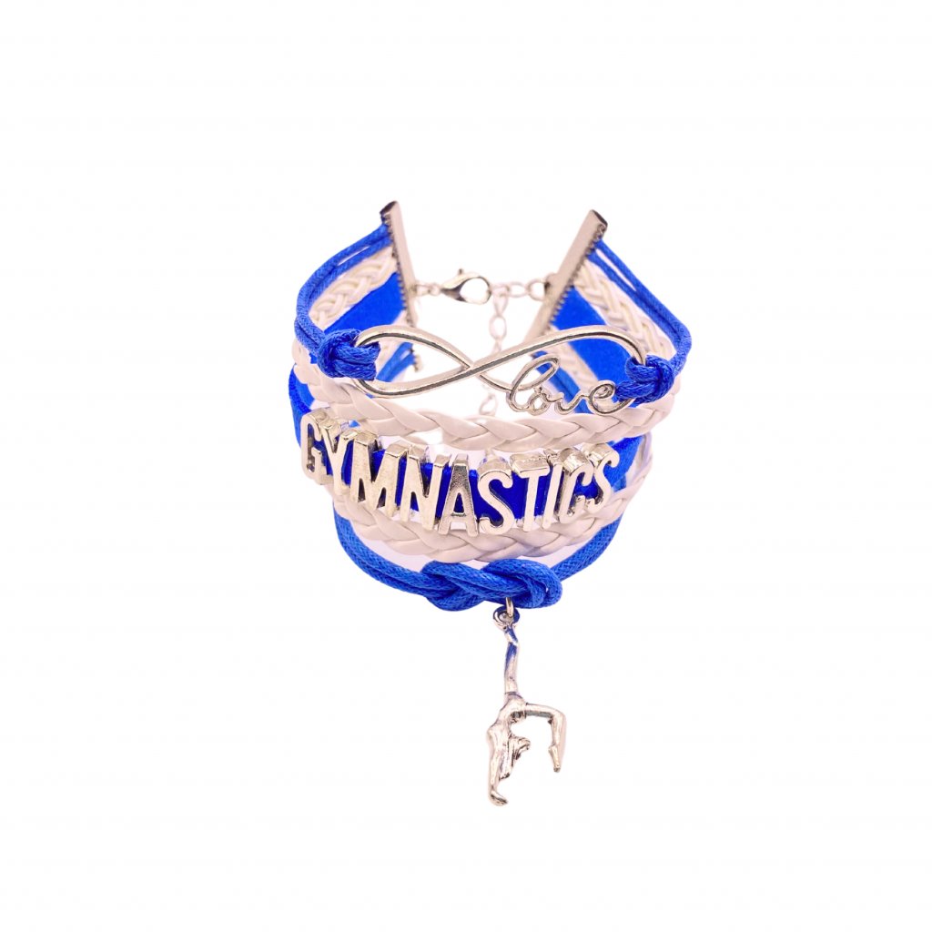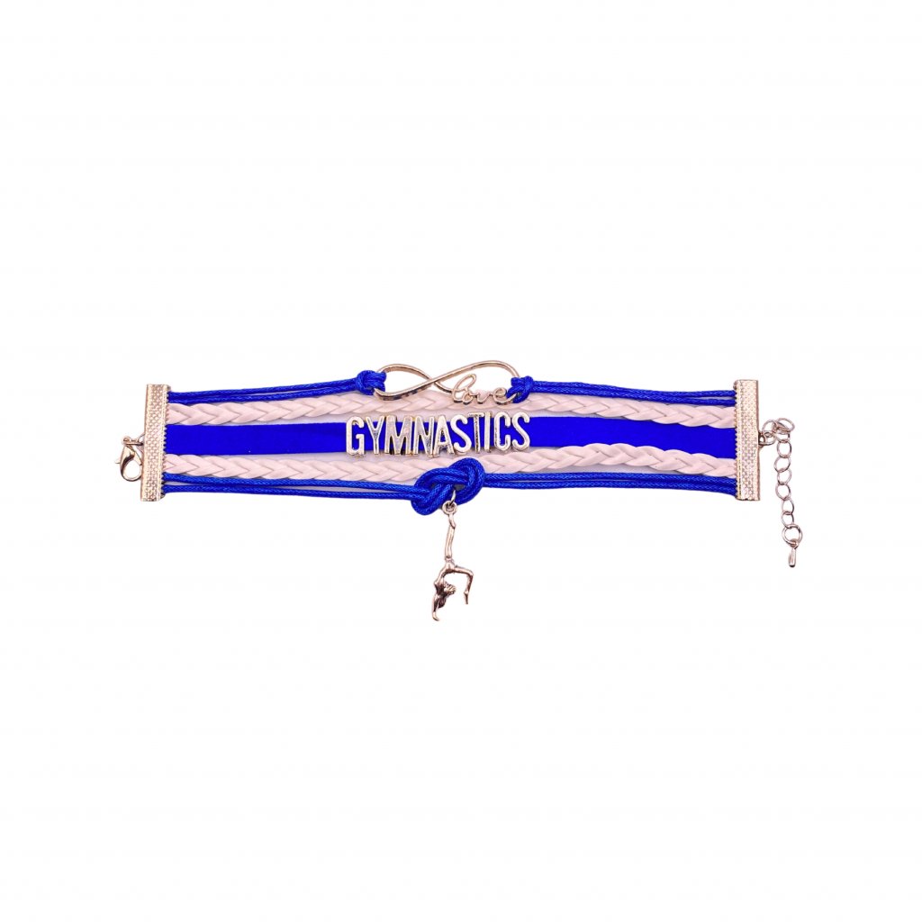 Elegantní pletený náramek na ruku. Náramek se skládá ze tří pletených šňůrek a dvou obyčejných. Na pletených šňůrkách je nápis GYMNASTICS z rhodinovaného stříbra. Na obyčejných šňůrkách je navlečený elegantní nápis LOVE a přívěšek GYMNASTKY.