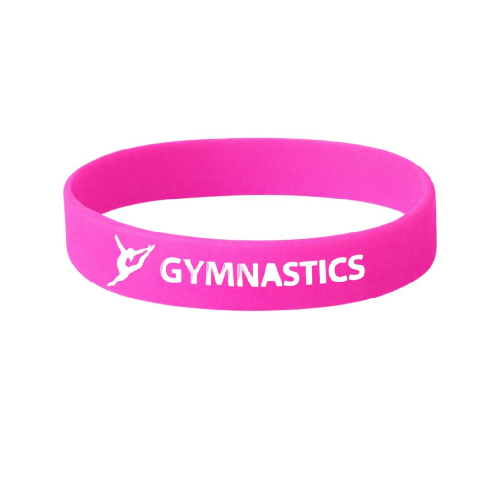 Náramek na ruku z pružného silikonu. Náramek je v jasně modré, růžové, fialové, žluté a zelené barvě s bílým nápisem Gymnastics a motivem gymnastky. Na druhé straně je logo našeho GYMSHOPu.
