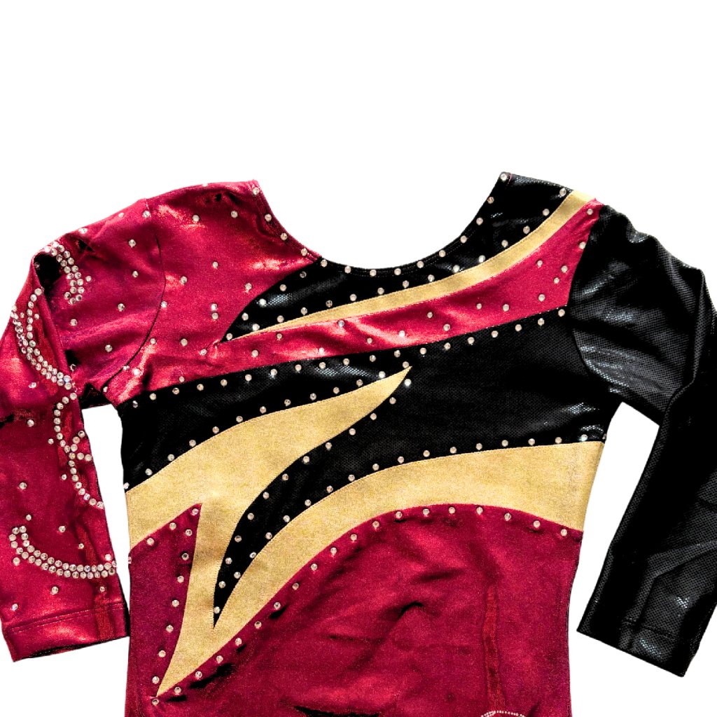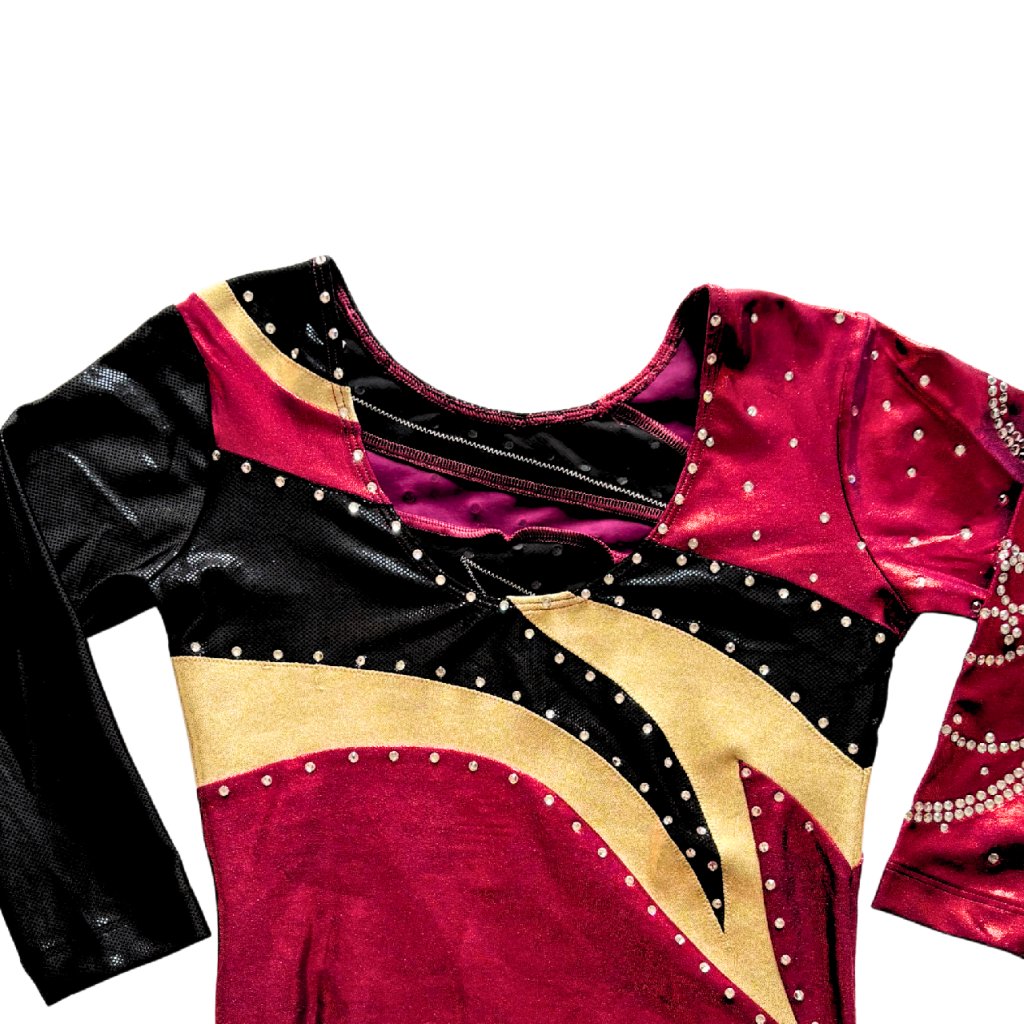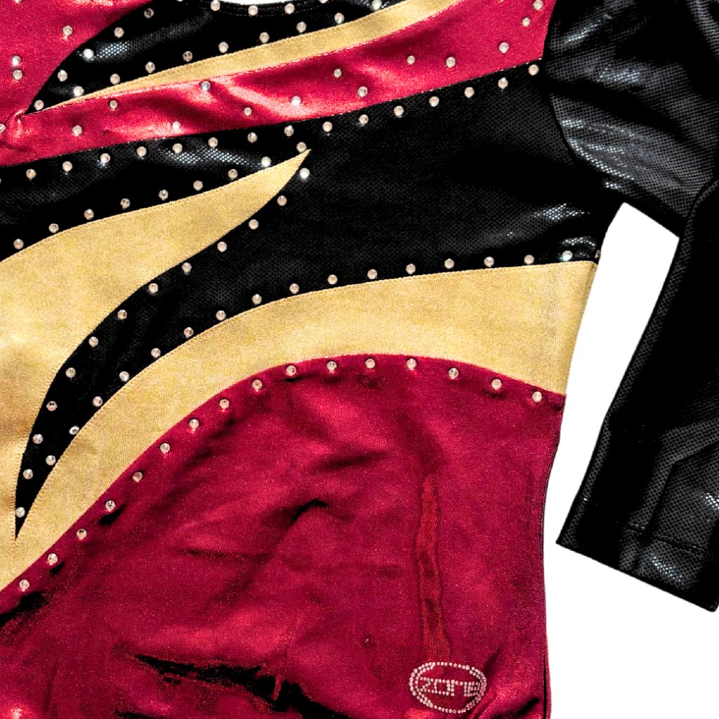 Asymetricky střižený dres s tříčtvrtečním rukávem od značky OZONE. Základní barvou tohoto dresu je lesklá barva bordeaux, která je doplněna zlatou a černou barvou. Látka je typu lack-shine.