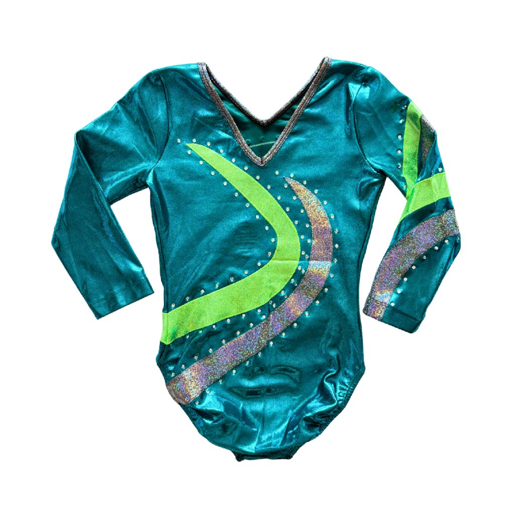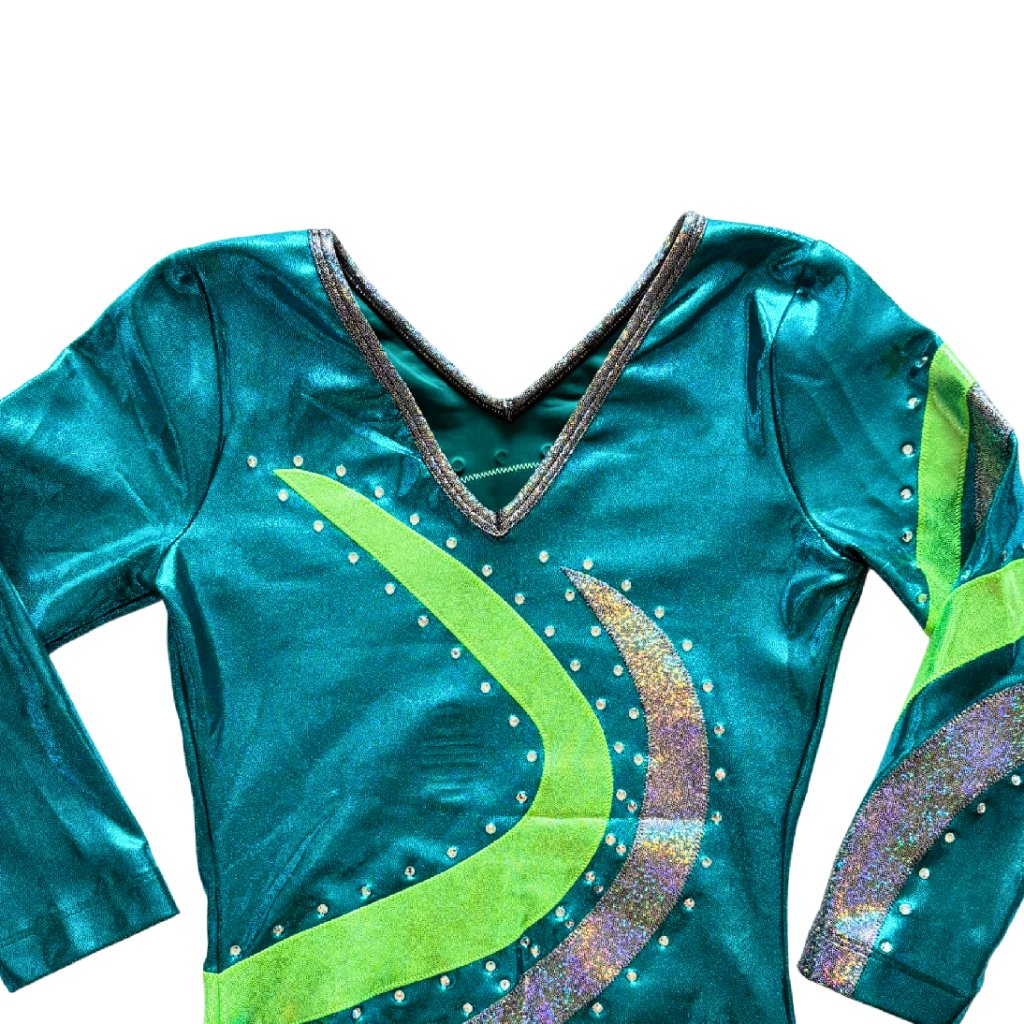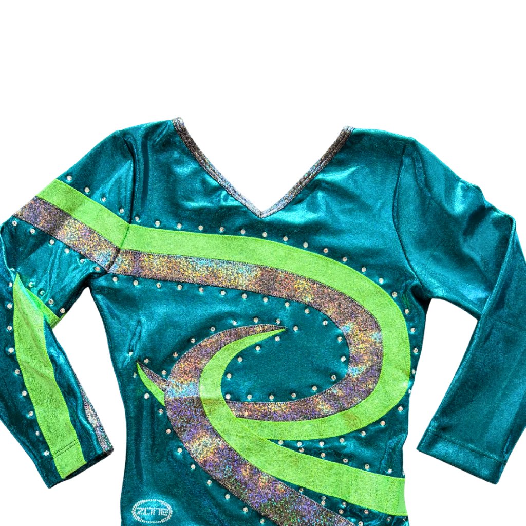 Sportovně střižený dres s tříčtvrtečním rukávem od značky OZONE. Základní barvou tohoto dresu je petrolejová lesklá látka, která je doplněna barvou kiwi a graffitti. Látka je typu lack-shine.