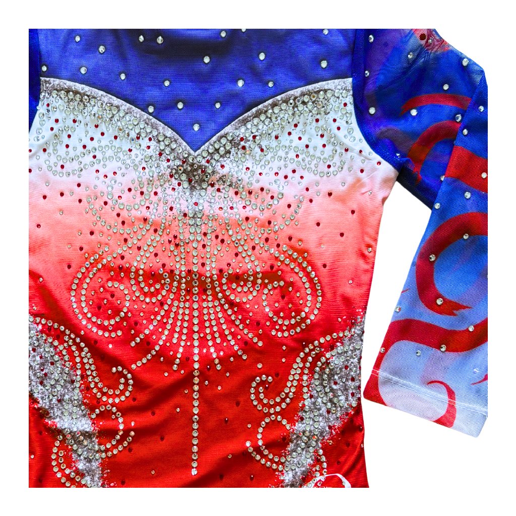 Dres je bohatě dozdoben stříbrnými kamínky a to i na rukávech. Výstřih je ve tvaru U vpředu i vzadu a je lemován bílou. Vzadu je má dres zapínání na háčky a tím je vytvořen elegantní průstřih. Průstřih je dodatečně částečně podšit bílou síťkou, aby byl dres vhodný pro závody.