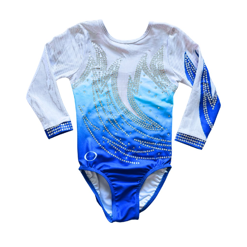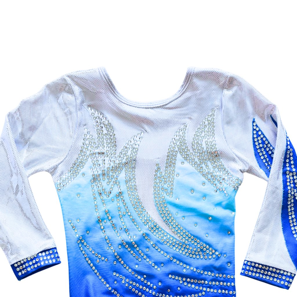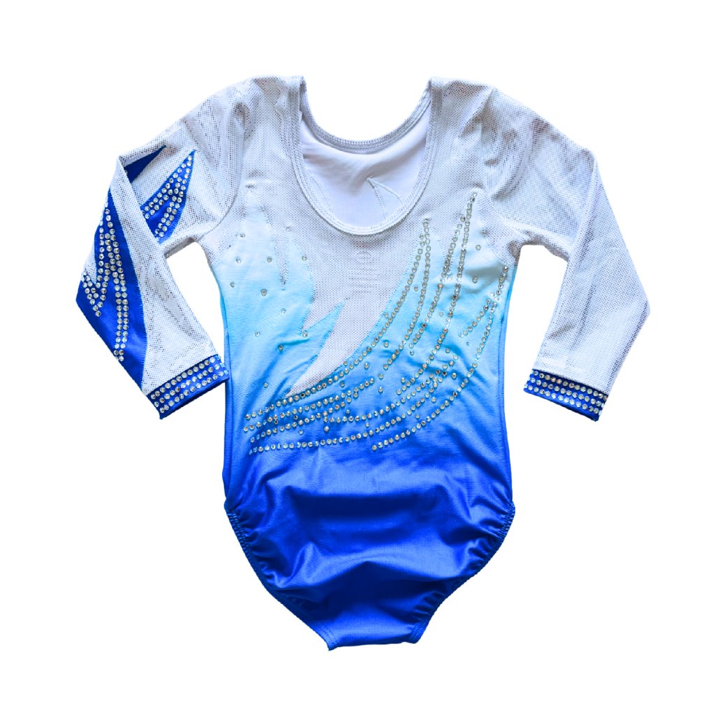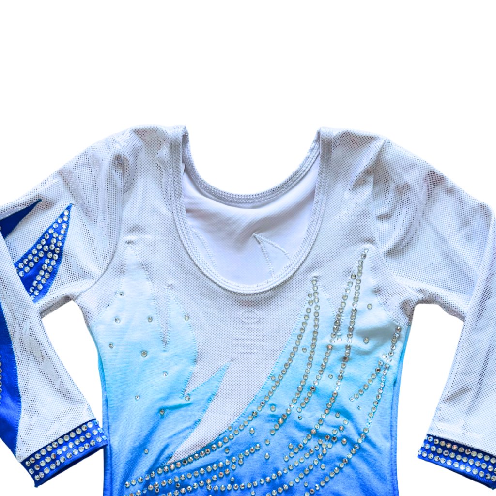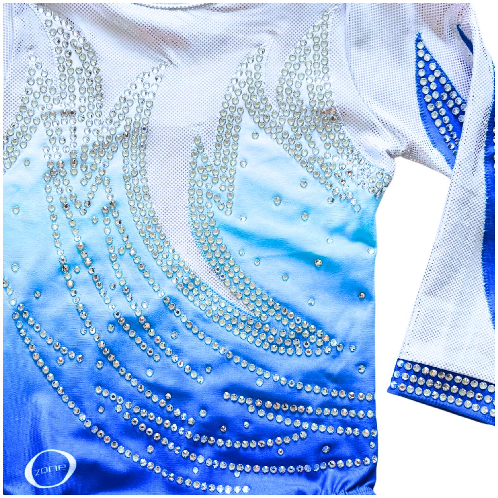 Elegantní závodní dres s tříčtvrtečním rukávem od značky OZONE. Spodní část dresu je v matné barvě v modrém ombré stylu. Horní část tvoří třpytivá, stříbrná látka, stejně jako část rukávů.