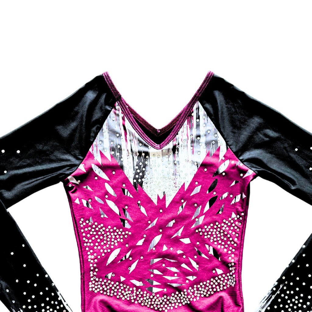 Dres je dozdoben stříbrnými kamínky. Výstřih je ve tvaru V vpředu i vzadu a je lemován vínovou, lesklou barvou.
