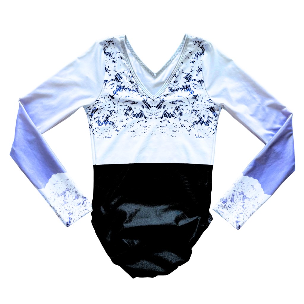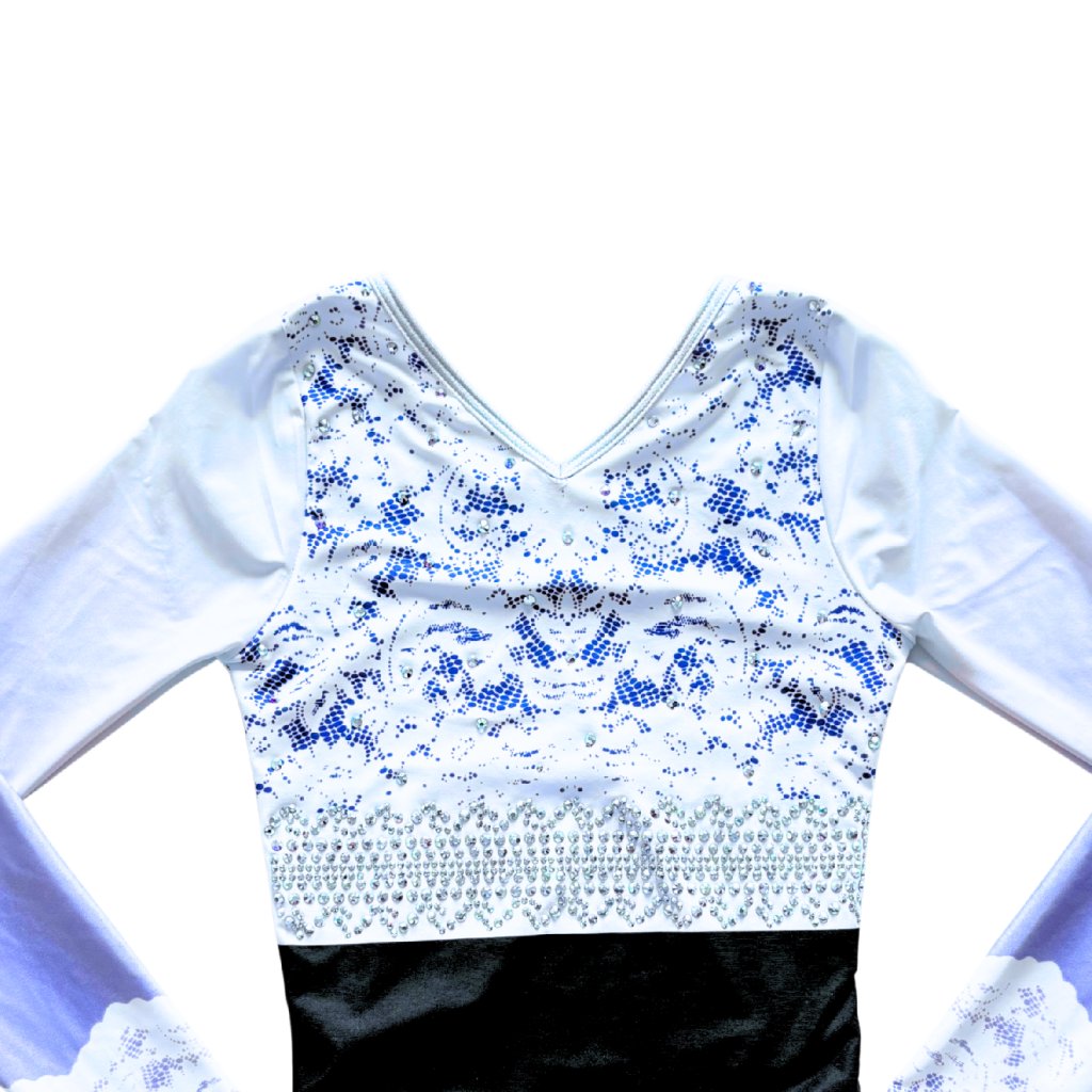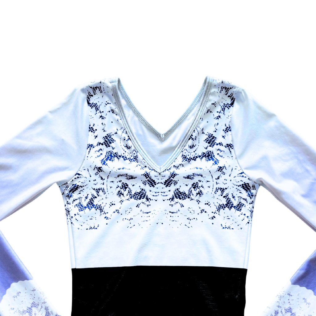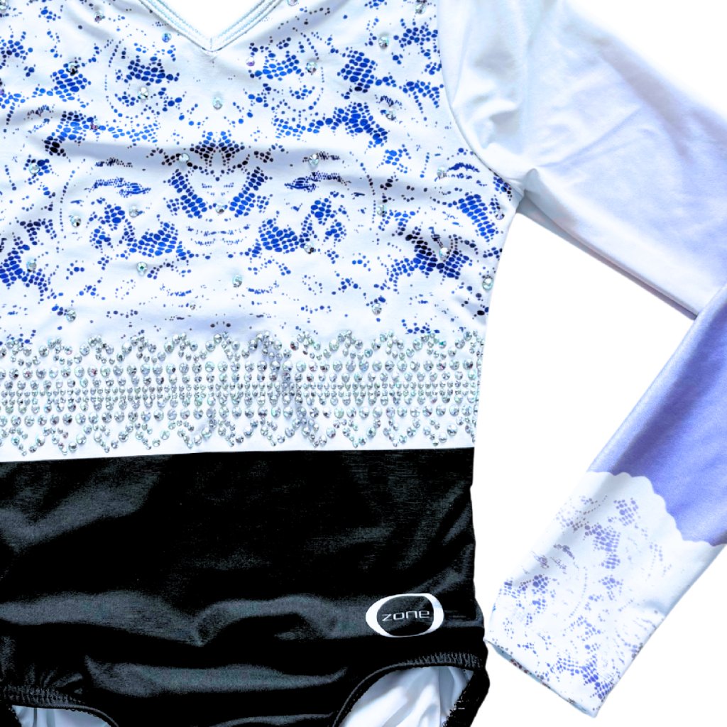 Elegantně střižený dres s dlouhým rukávem od značky OZONE. Spodní část dresu je černá. Horní polovina je bílá s modrými digitálním potiskem. Rukávy přechází do světle fialové.