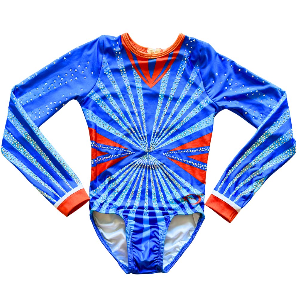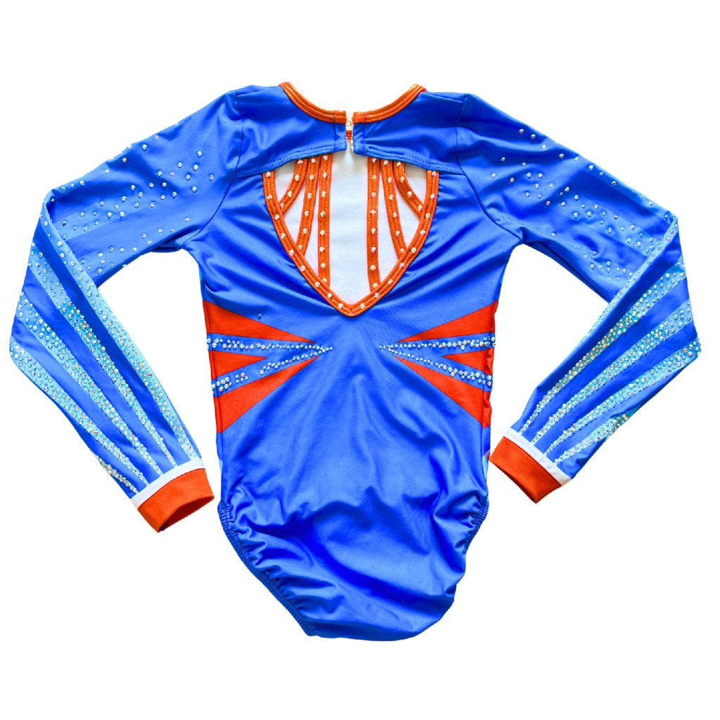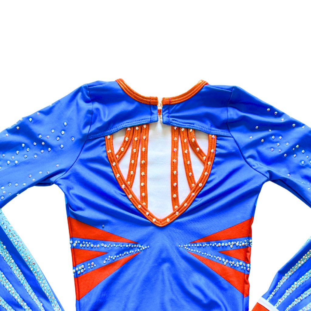 Dres je bohatě dozdoben stříbrnými kamínky a to i na rukávech. Výstřih je ve tvaru U vpředu i vzadu a je lemován oranžově. Vzadu je má dres zapínání na háčky a tím je vytvořen elegantní průstřih.
