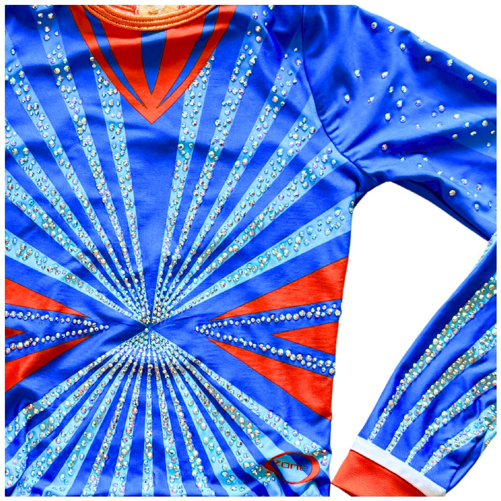 Netradiční závodní dres s dlouhým rukávem od značky OZONE. Základní barvou tohoto dresu je matná tyrkysově modrá látka, která je digitálně potištěna světle modrými pruhy a oranžovými pruhy.