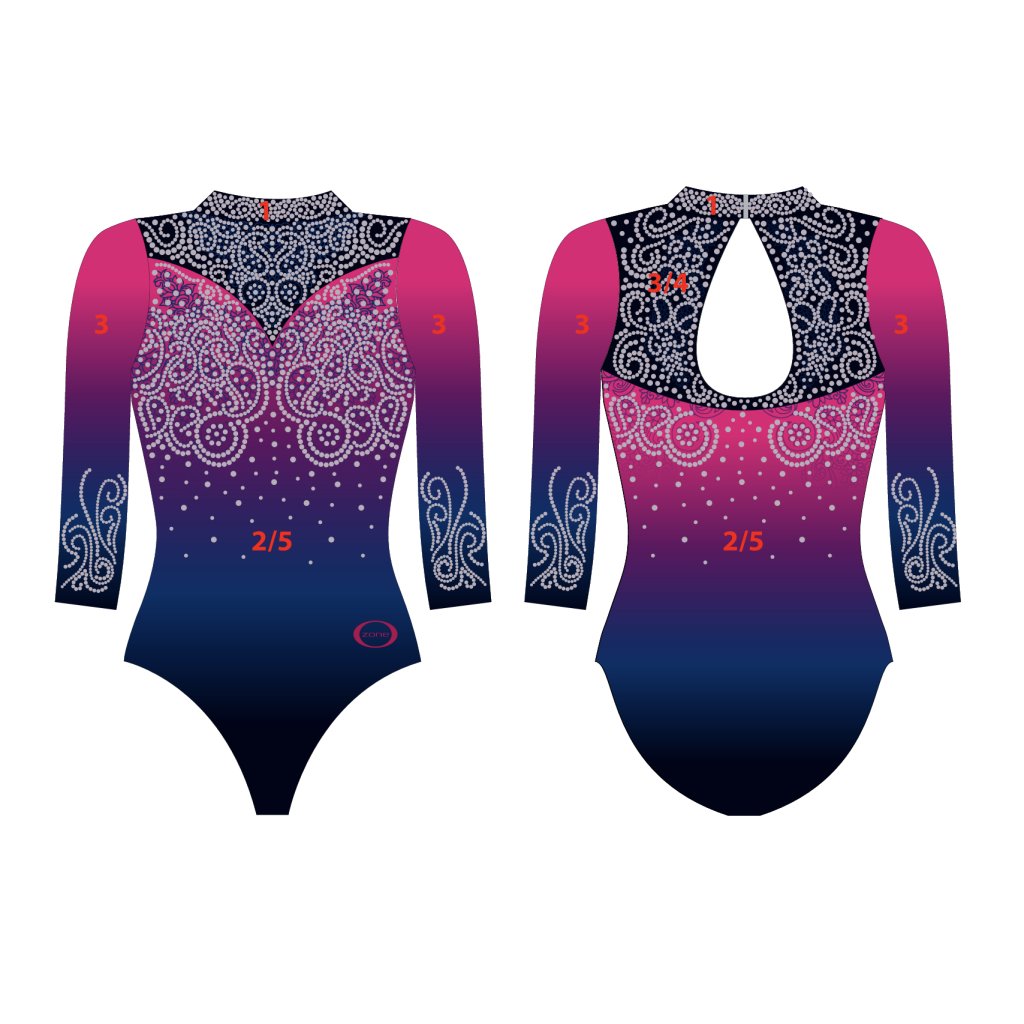 Elegantní a výrazný závodní dres s dlouhým rukávem od značky OZONE. Základní barvou tohoto dresu je tmavě modrá matná látka, která je doplněna růžovo-fialovým přechodem. Dres má na zádech slzu. . Dres je bohatě dozdoben stříbrnými kamínky.