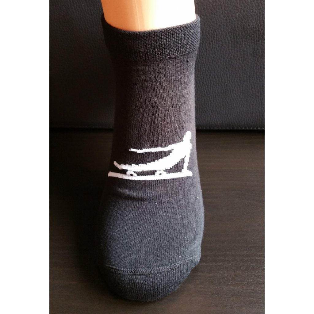 Ponožky jsou bílé, kotníkové a nártu odlehčené. Na patě je širší guma, takže krásně drží a nepadají. Na lemu, kolem kotníku je černý nápis Gymnastics a silueta gymnastky v provazu. Stejná silueta, v černé barvě je i na nártech. Ponožky jsou univerzální - dámské i pánské.Číslování je metrické.