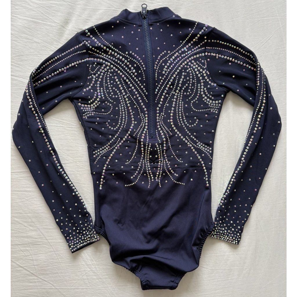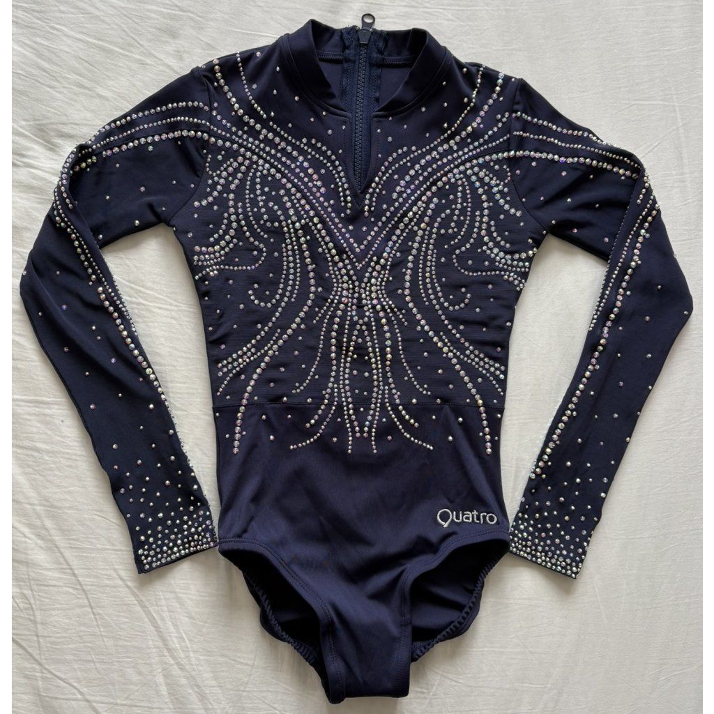 Nádherný a netradiční závodní dres Quatro. Dres je elegantní s dlouhým rukávem. Základní látkou je tmavě modrá - navy barva. Dres je bohatě dozdoben stříbrnými kamínky. Výstřih je ke krku s stojáčkem a vzadu je dres na zapínání na zip.