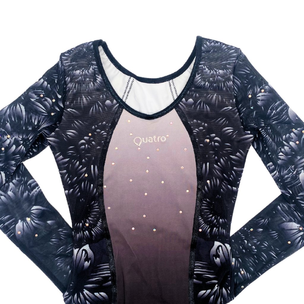 Jeden z nepovedenějších dresů Quatro. Velmi elegantní a krásný závodní dres s dlouhým rukávem. Základní barvou dresu je matná látka typu plavkoviny ve stylu ombré - látka přechází z černé vínové do světle růžové barvy. Na přední i zadní části jsou dva svislé proužky v černé barvě. Boky dresu a rukávy jsou ušity z černé látky, která je digitálně potištěna šedými vzory, které na dresu tvoří zajímavý 3D efekt. Výstřih je typu U, vzadu je mírně protažený. Dres je na přední i zadní části, včetně rukávů poset stříbřitými, strassovými kamínky. Tělo dresu je podšito, aby dres nebyl průsvitný.