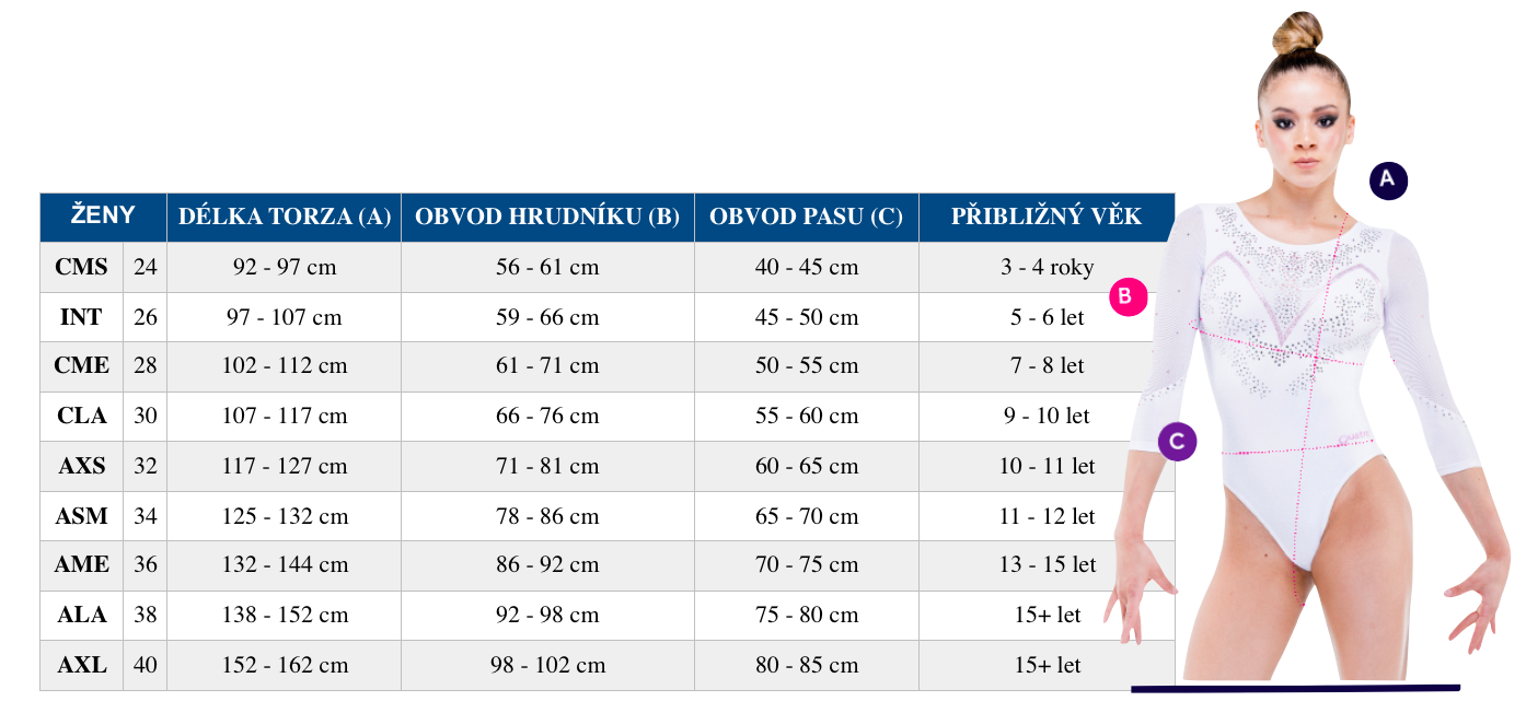 Upozornění: Tabulka velikostí je převzata přímo od výrobce Quatro gymnastics a společnost Gymshop nenese odpovědnost za případné nepřesnosti