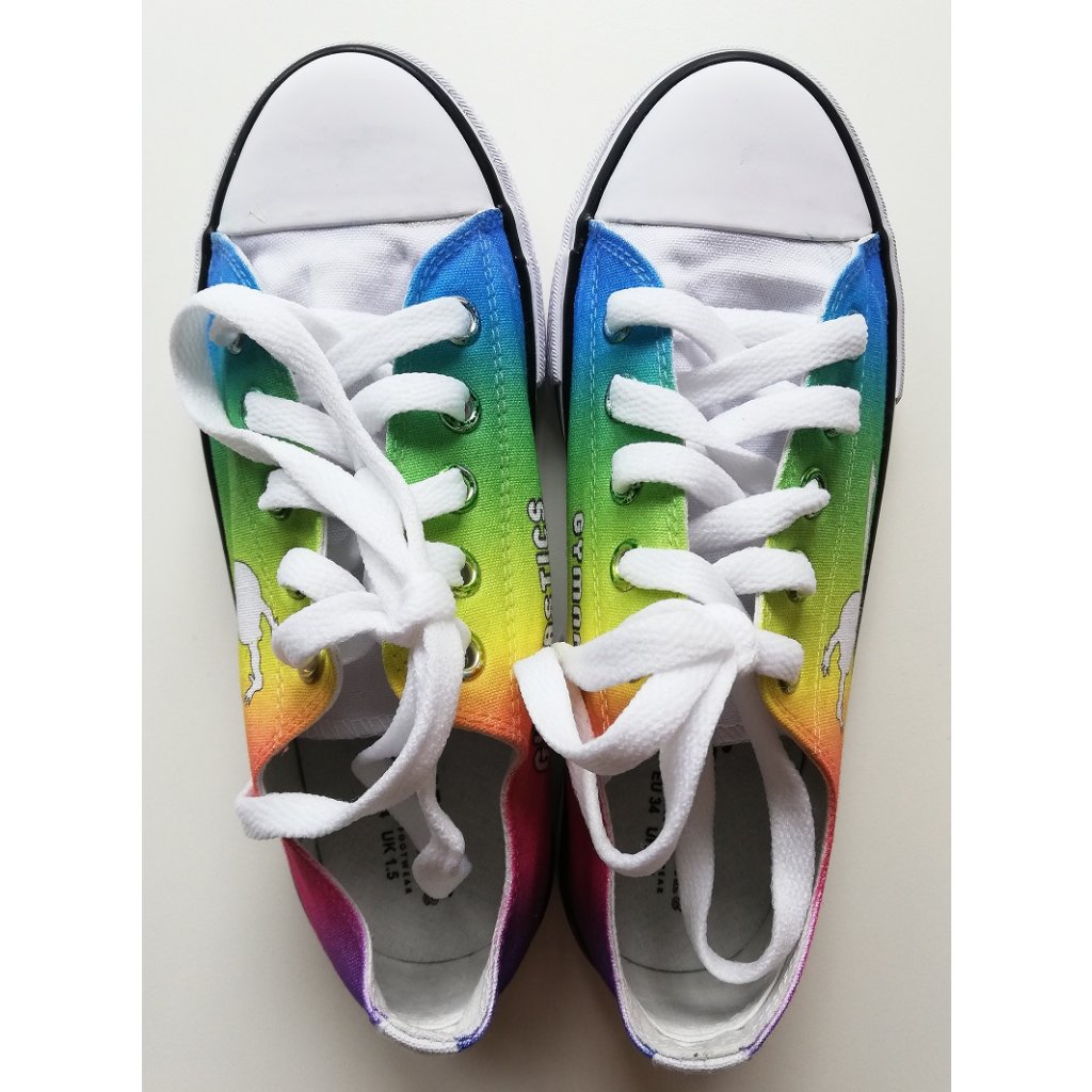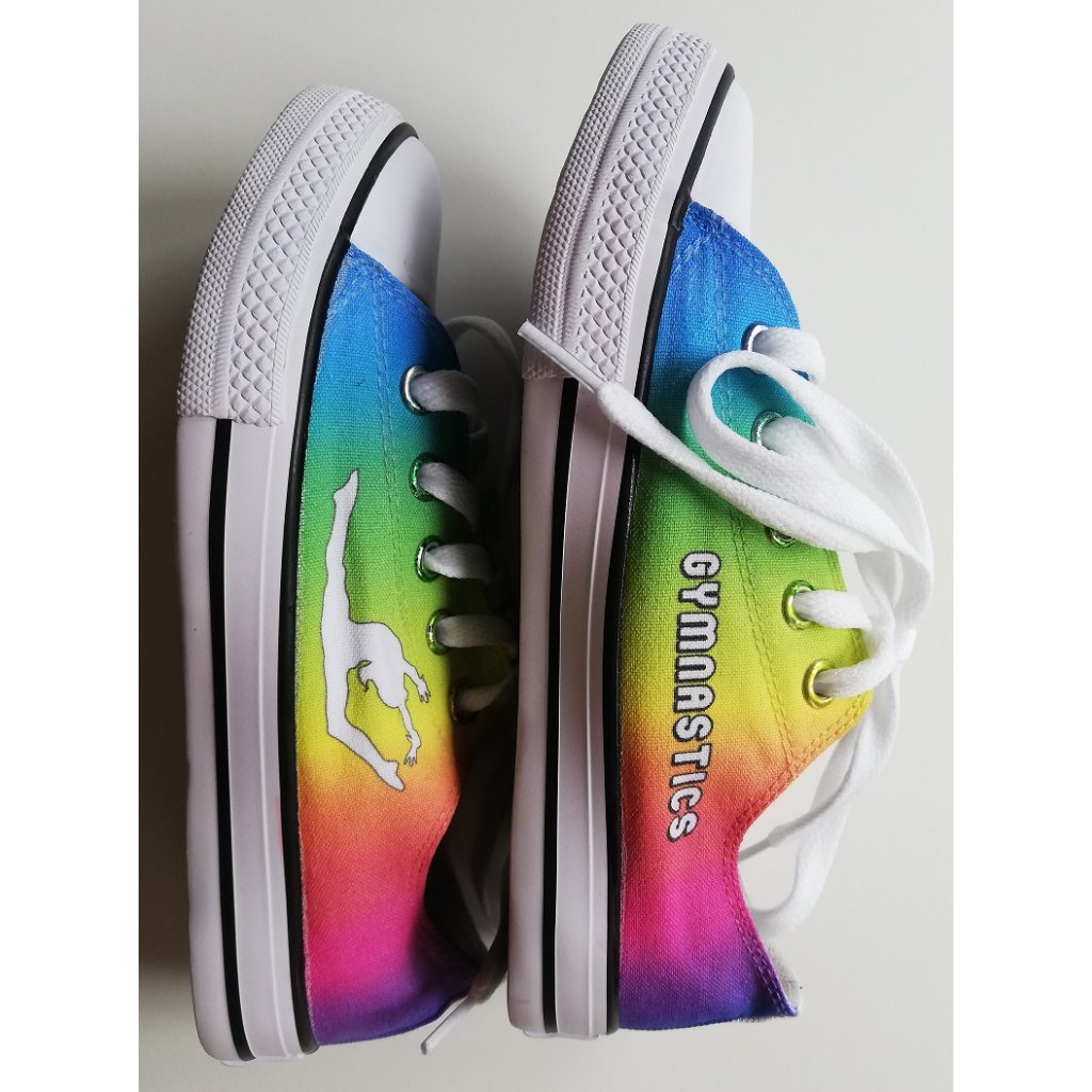 "Plátěnky" našeho vlastního designu. Botky jsou v duhové barvě po obou stranách, snadno se nazouvají a jsou vhodné na denní nošení. Boty mají na vrchní straně šněrování s bílou tkaničkou. Jazyk boty je ze stejného materiálu, jako celá bota. Na jedné straně je bílá silueta gymnastky ve skoku s roznožením a na druhé straně je bílý ozdobný nápis GYMNASTICS.