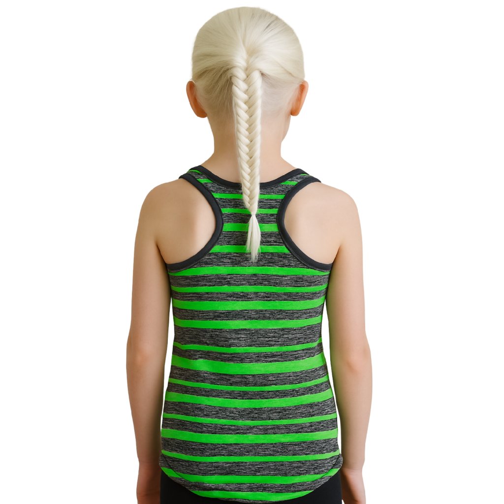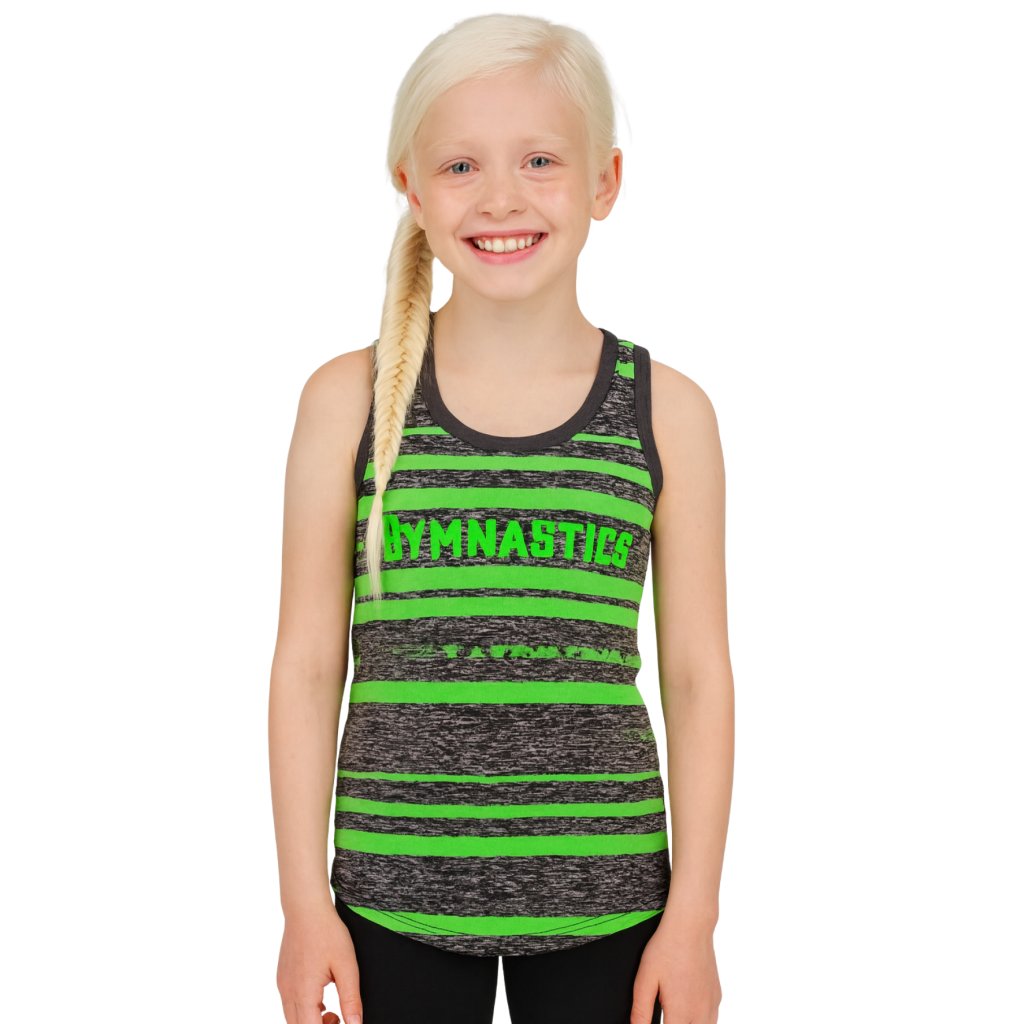 Základ tvoří světle šedá barva, na níž vynikají digitálně natištěné svítivě zelené proužky. Na přední části tílka je umístěn potisk GYMNASTICS v neonově zelené barvě.
