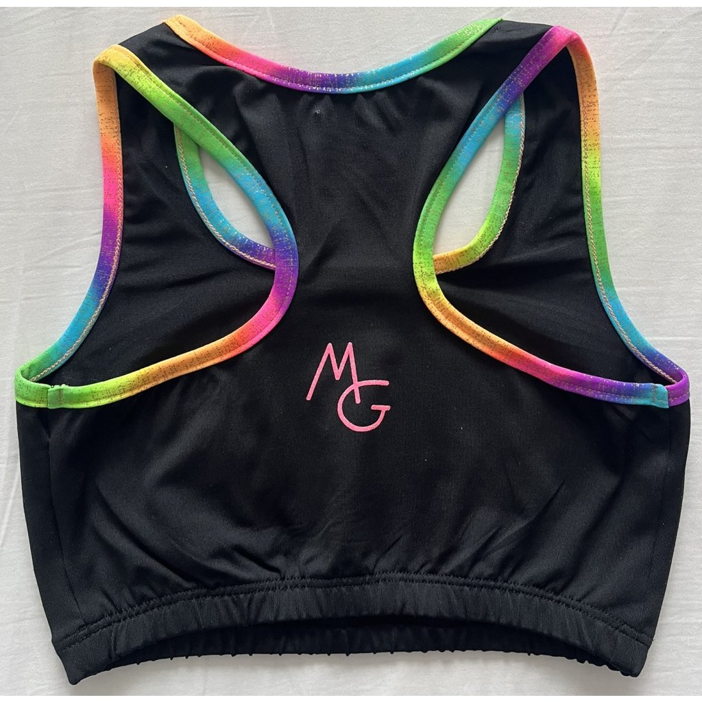 Délka topu je pod prsa. Vpředu je růžový nápis GYMNASTICS.