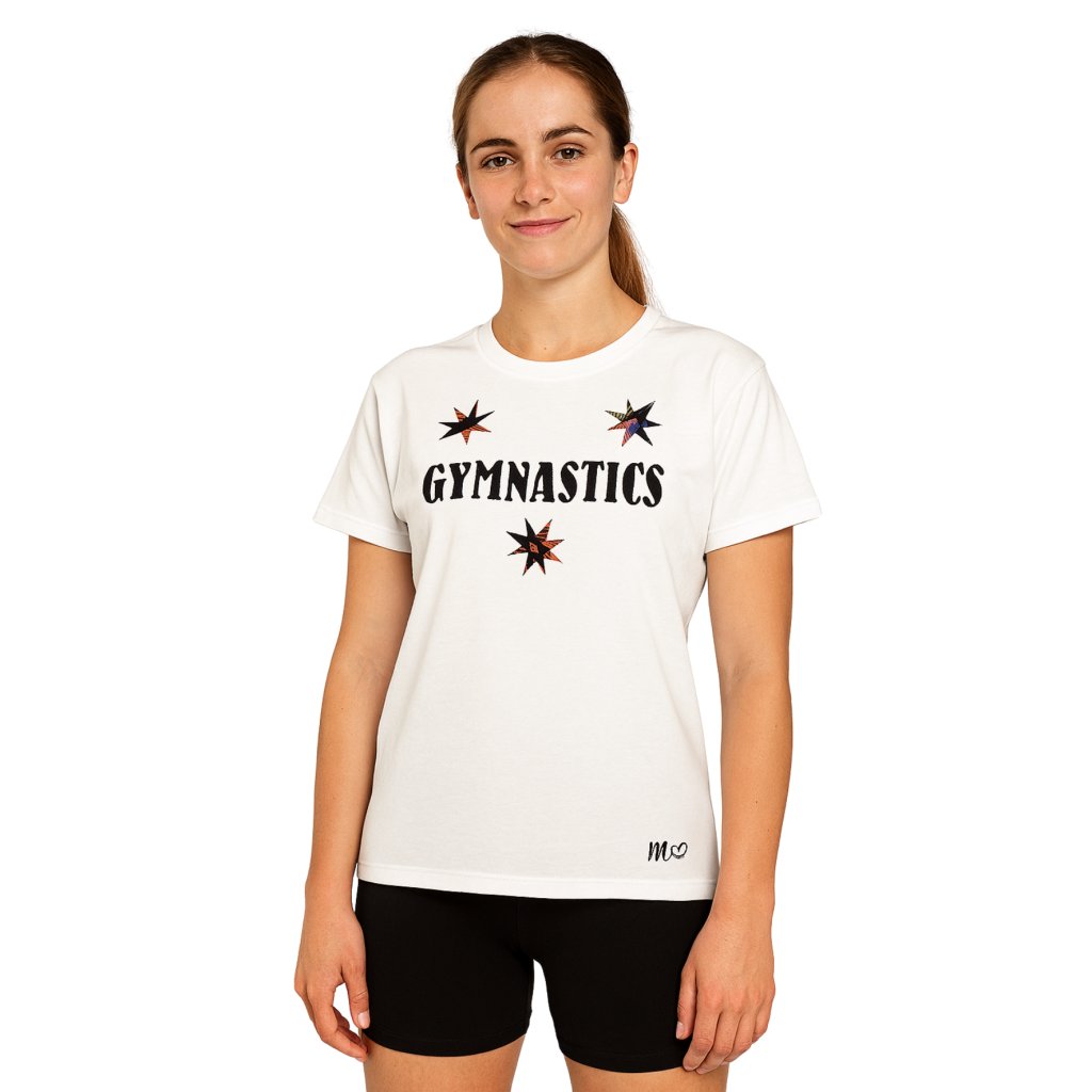 Vyrobené z kvalitní 100% bavlny v čisté bílé barvě, s projmutým dámským/dětským střihem pro pohodlné nošení. Přední straně dominuje velký černý nápis GYMNAST doplněný barevnými hvězdičkami.