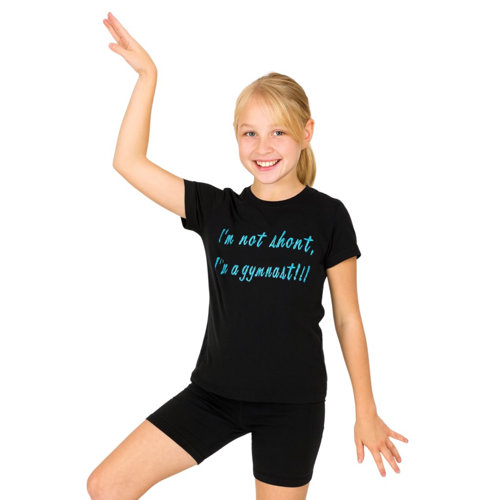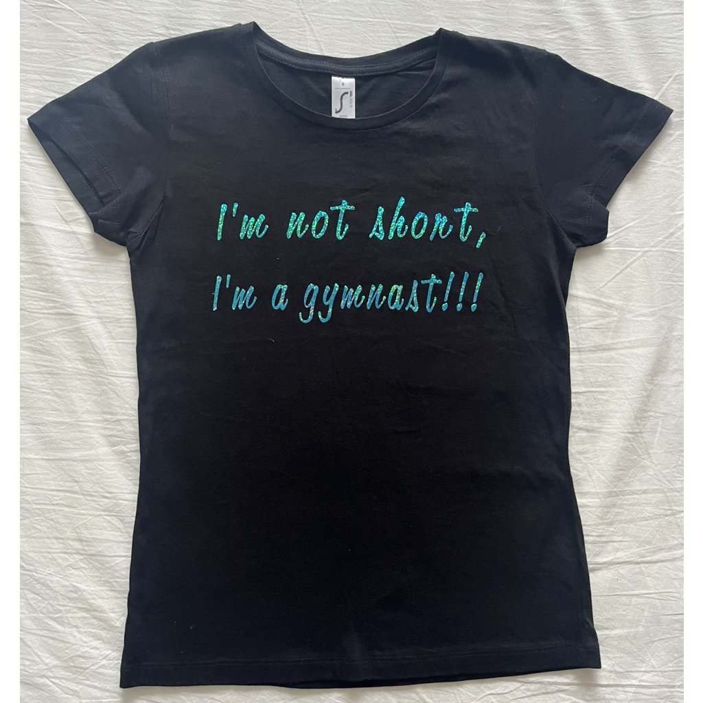 Vyrobené z kvalitní 100% bavlny v elegantní černé barvě, s pohodlným projmutým střihem, který perfektně sedí. Na přední straně září výrazný holografický modrý nápis "I am not short, I am a gymnast!!!"
