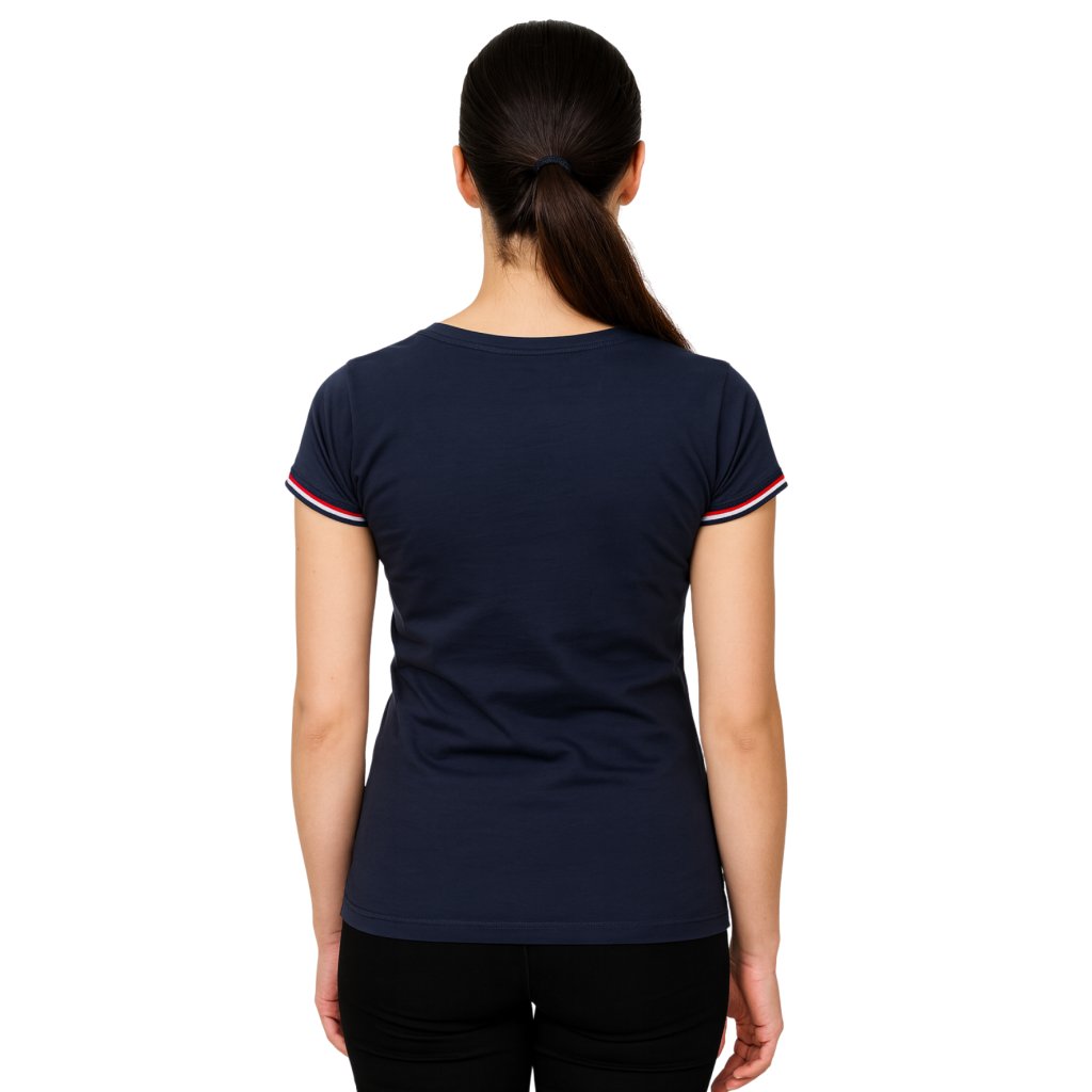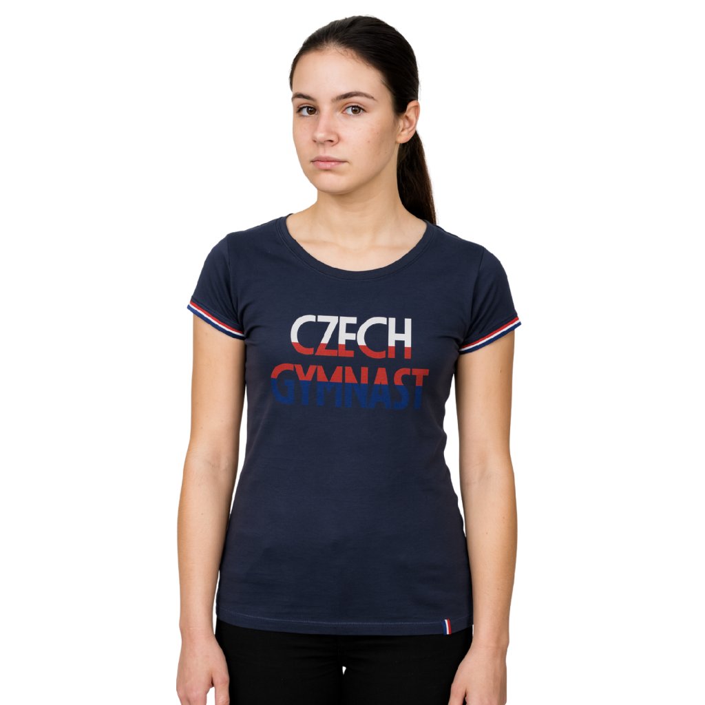 Vyrobené z kvalitní bavlny v elegantní tmavě modré (navy) barvě, s projmutým dámským střihem pro pohodlné nošení. Rukávy zdobí lemování v trikoloře, které dodává tričku sportovní a národní vzhled. Na hrudi září výrazný nápis CZECH GYMNAST.
