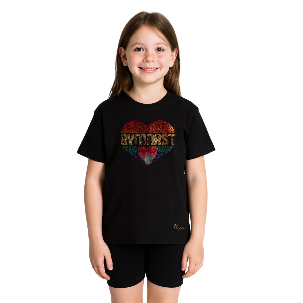 Ušité z kvalitní 100% bavlny v klasické černé barvě, s projmutým dámským/dětským střihem, který perfektně padne a je pohodlný na nošení. Přední stranu zdobí třpytivé srdce z barevných glitrů s nápisem GYMNAST, které dodává tričku originální a zářivý vzhled.